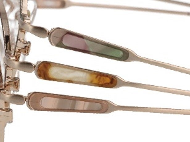 オトナの装いとして気品のあるサイドビューにこだわりました。こめかみ部分の額縁に美しいアセテート生地が光る職人技です。丸みを帯びた丁番(接合部分)との対比が他にはない繊細さ。