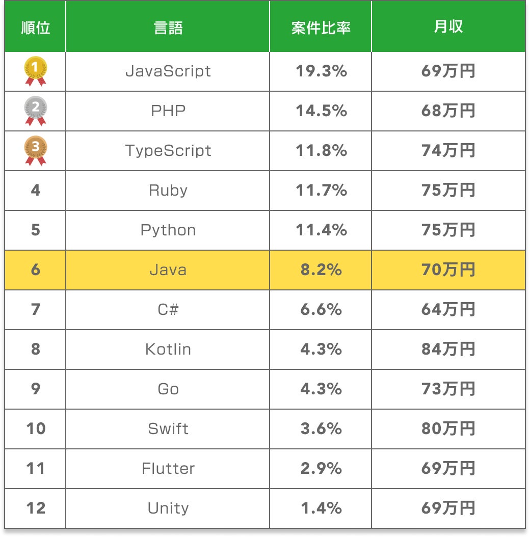 Javaは全プログラミング言語案件の中で8.2%を占めており、案件数ランキングでは6位に位置しています。この比率は、Javaが依然として企業システムやWebアプリケーション開発において重要な言語であることを示しています。特に大規模システムや基幹業務系のアプリケーションでの需要が安定しており、エンジニアにとって就業機会の多い言語の一つといえるでしょう。多くの企業が既存のJavaシステムを維持・拡張する必要があるため、今後も一定の案件数が継続すると予測されます。