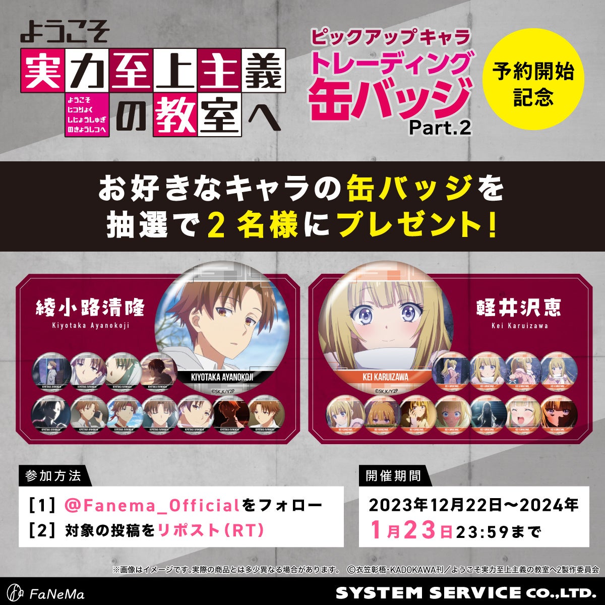TVアニメ『ようこそ実力至上主義の教室へ』新商品トレーディング缶バッジ第2弾の予約開始を記念して、X(旧Twitter)フォロー&リポストキャンペーンを実施いたします。