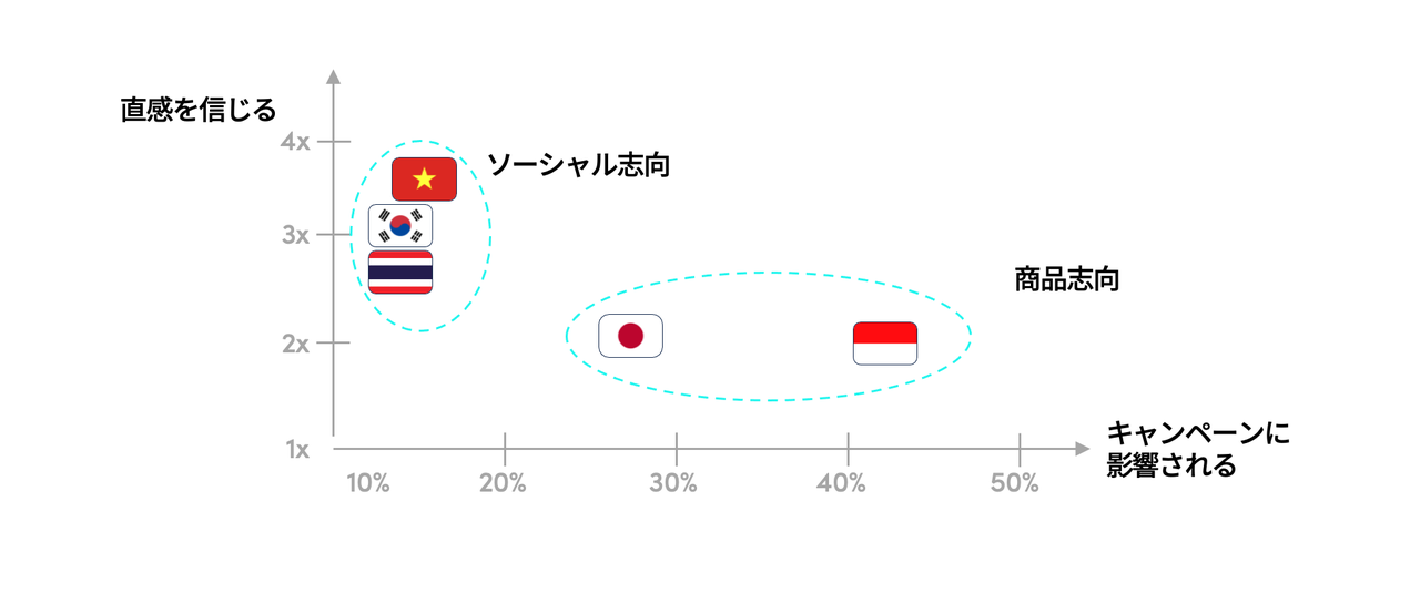 APACの市場には、”ソーシャル志向”と”商品志向”という2つの異なる消費傾向が見られます。ソーシャル志向のタイ、ベトナム、韓国市場の消費者は、クリエイターからのレビューやレコメンドを信頼し、感情や直感でコンテンツを評価する傾向が強く、追加の情報収集をせずに意思決定を行います。一方、商品志向の日本、インドネシア市場の消費者は、誰がおすすめ・レビューしているかよりも、商品の詳細やお得な情報を重視します。