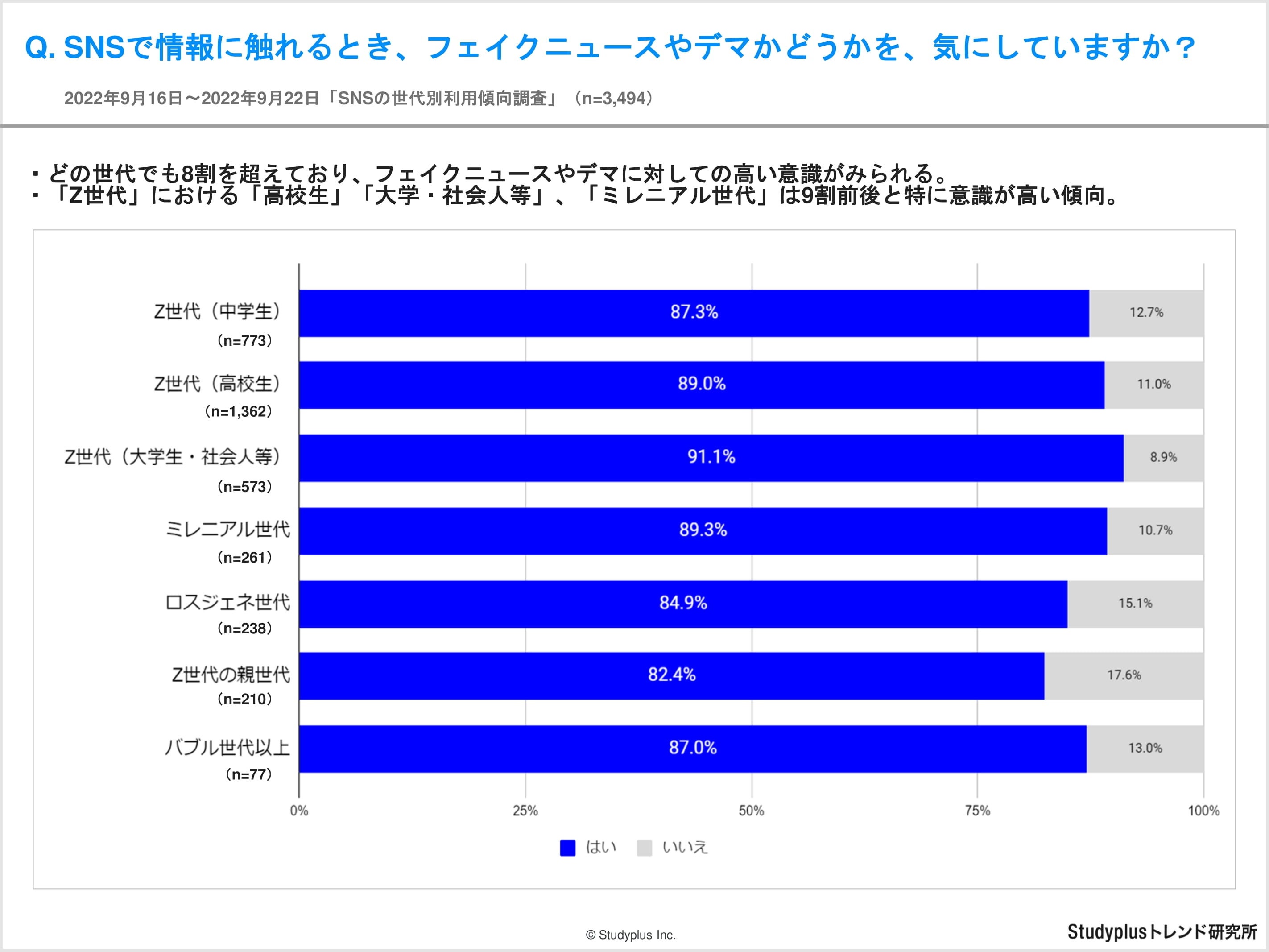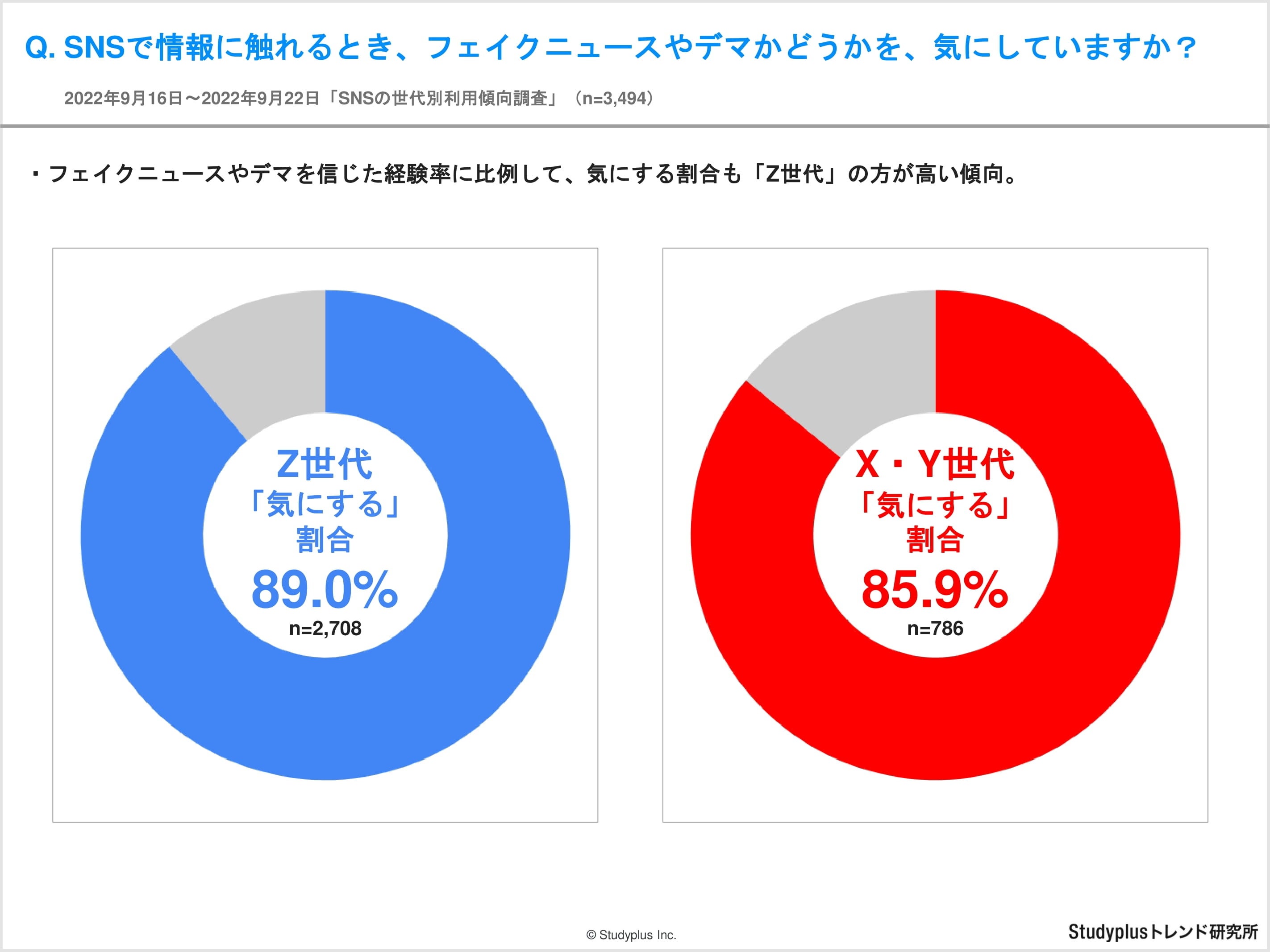 ② | SNS上でフェイクニュースやデマを気にする割合、「Z世代」は約9割。 |