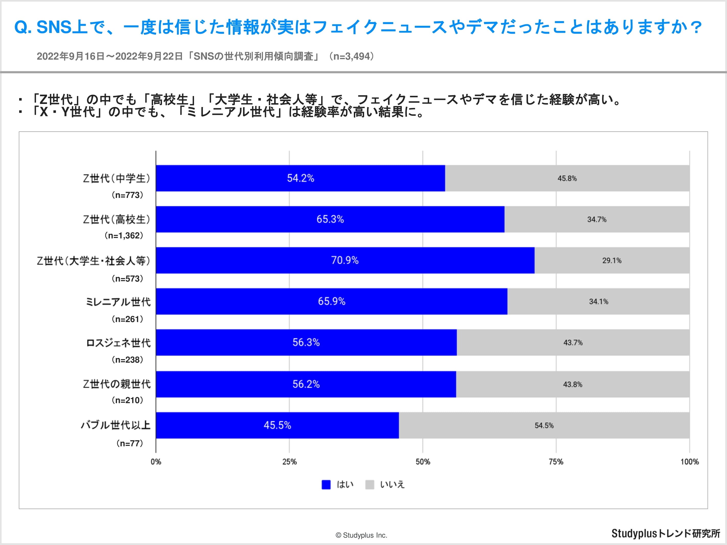 ・フェイクニュースやデマをSNS上で信じた経験は「Z世代」が6割超え。