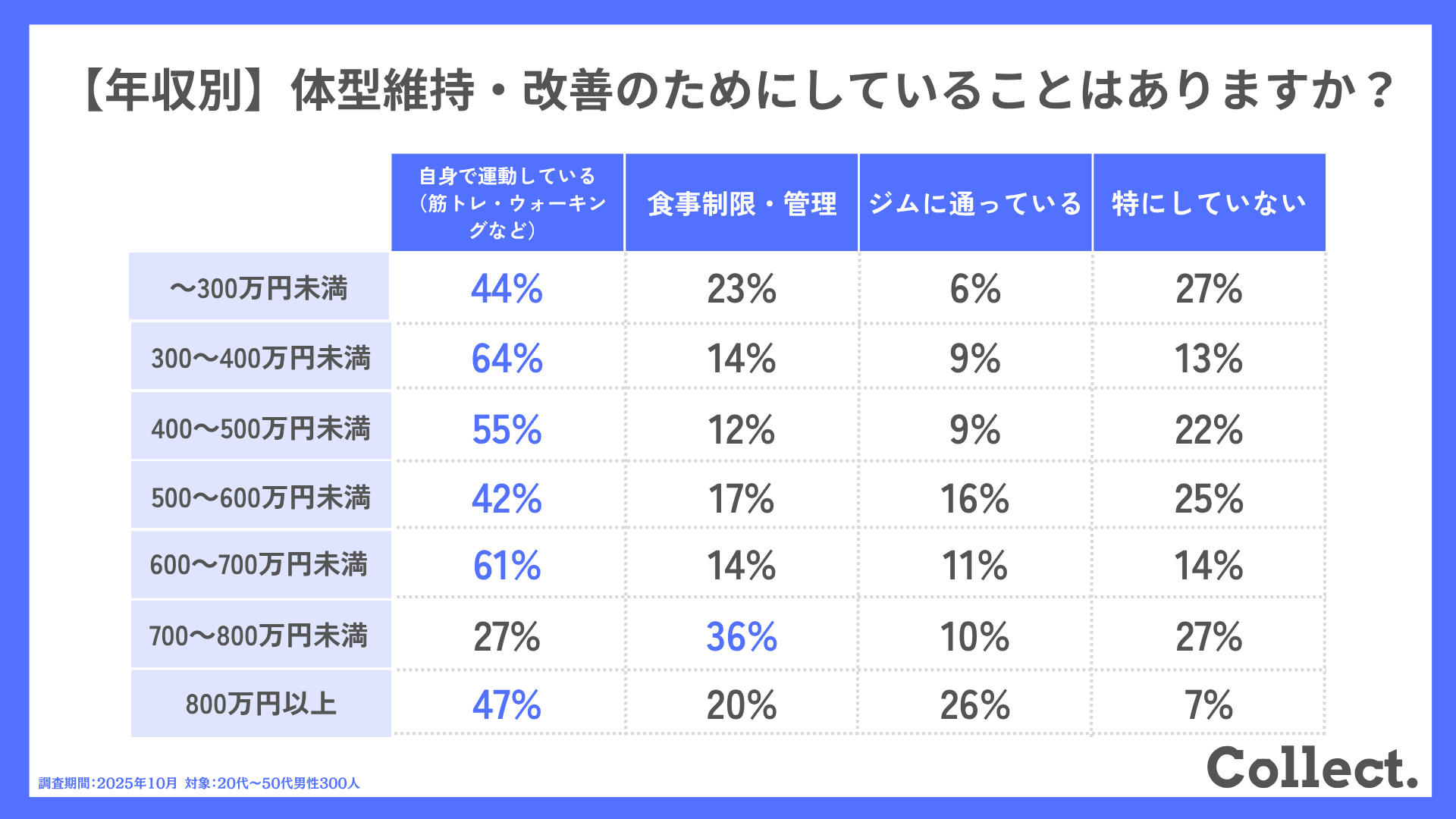 年収800万円以上では未実施7%と、93%が体型維持・改善のために何らかの取り組みを実施