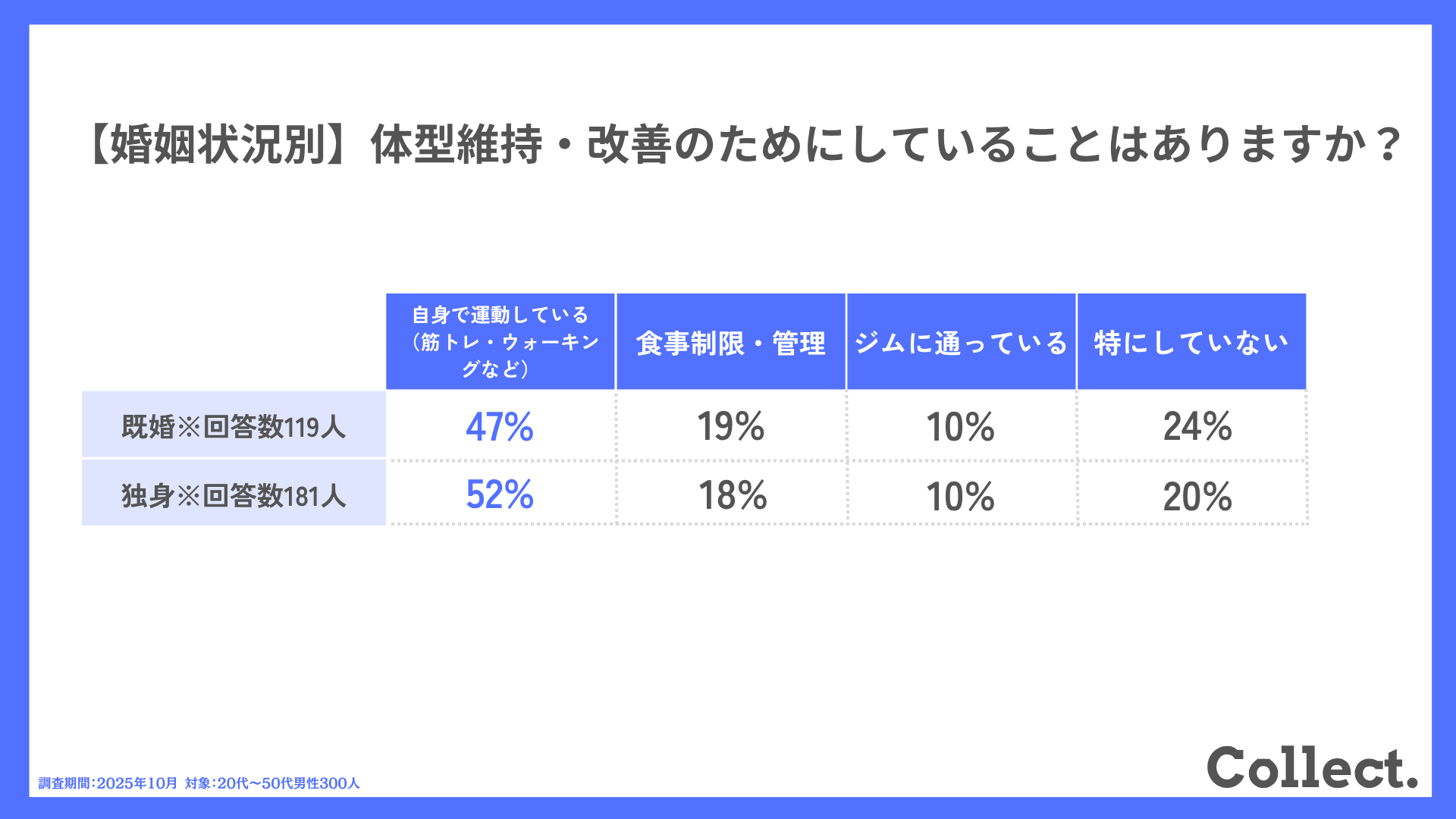 独身は「自身で運動」52%、「食事管理」18%、「ジム」10%、「特にしていない」20%でした。既婚に比べて主体的な取り組みがやや高く、未実施も低水準です。