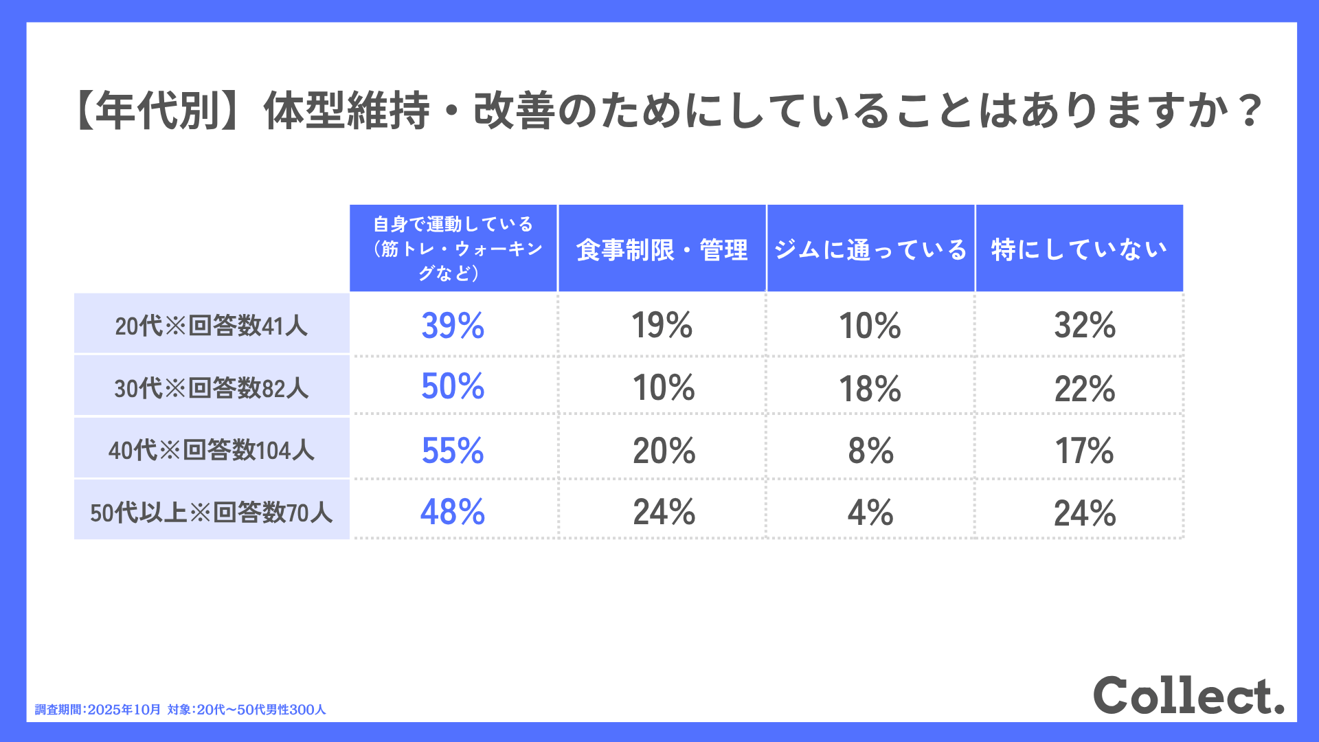体型ケアの世代差:20代は32%が「特に何もしていない」一方、40代では83%が体型維持の取り組みを実施【collect.(コレクト)】