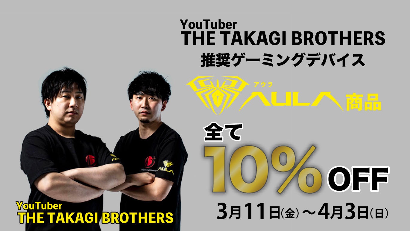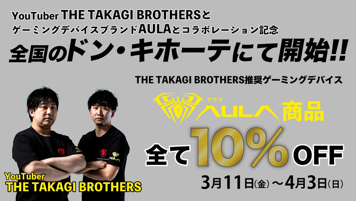 ゲーミングデバイスブランド「AULA」× YouTuber「THE TAKAGI BROTHERS」コラボ記念キャンペーン3月11日~4月3日まで全国のドン・キホーテ系列店にて10%OFFセール開催