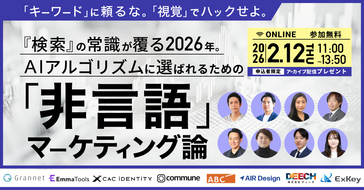 【2026年2月12日(木)開催】マーケティングの主戦場が「キーワード」から「視覚」へ移行する中、AIに選ばれ顧客の直感を動かす非言語マーケティングの極意を、各領域のプロ8社が語るカンファレンス。