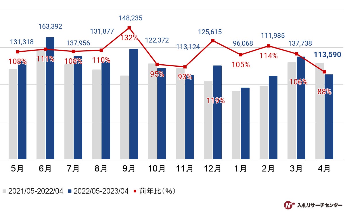 2023年4月の落札案件数の総計は113,590件で、前年比88%となりました。