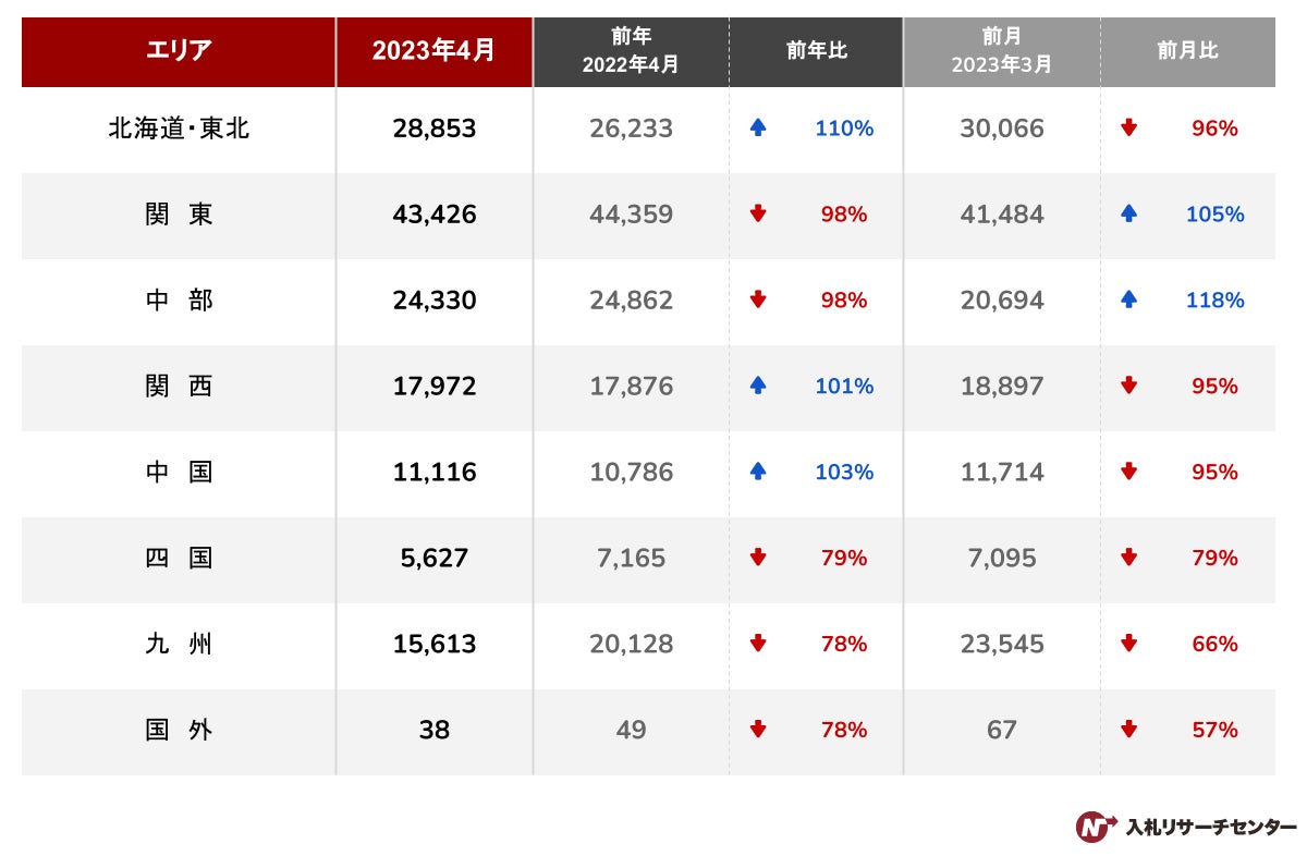 2023年4月のエリア別公示案件数は、エリアにより前年より増加・減少の傾向が分かれました。