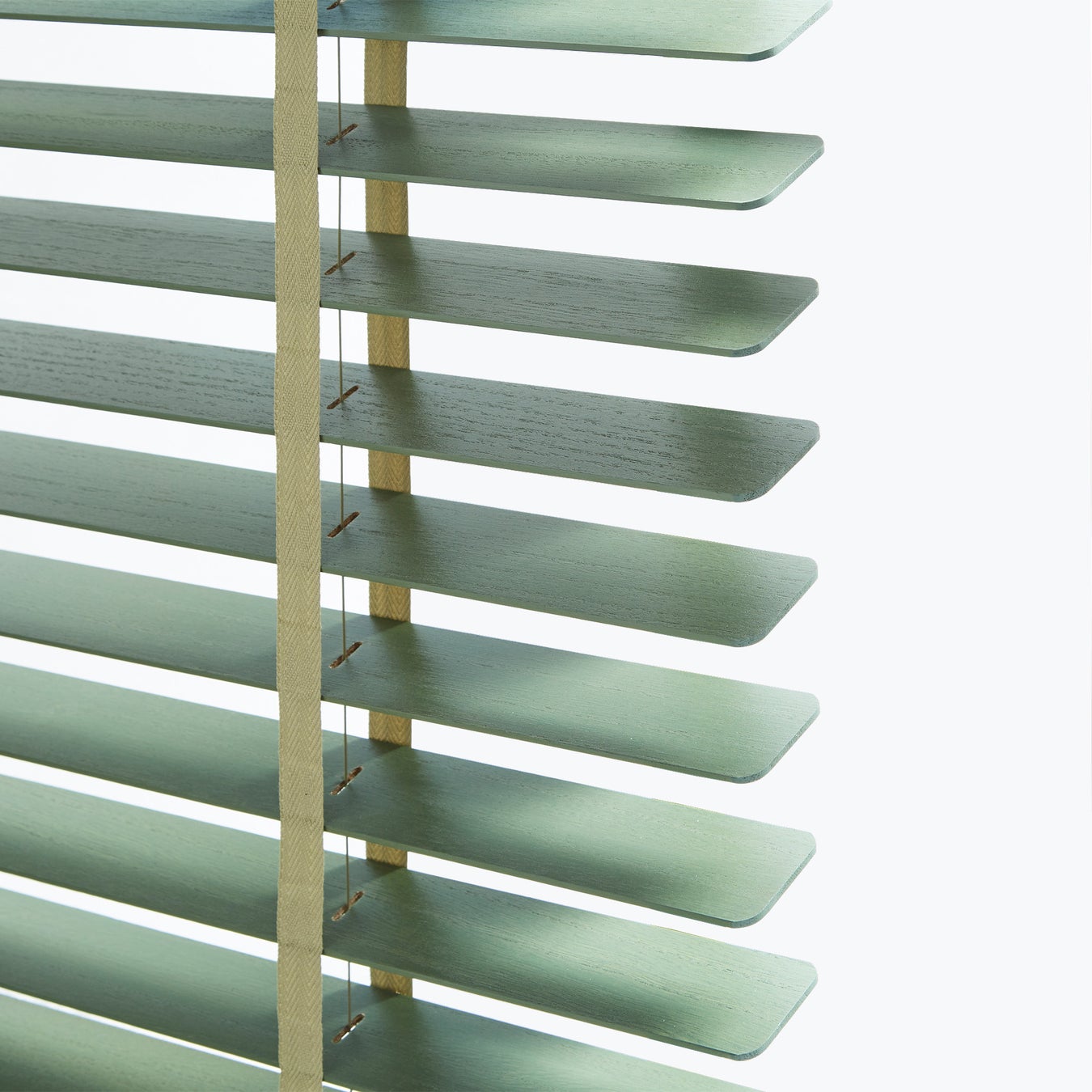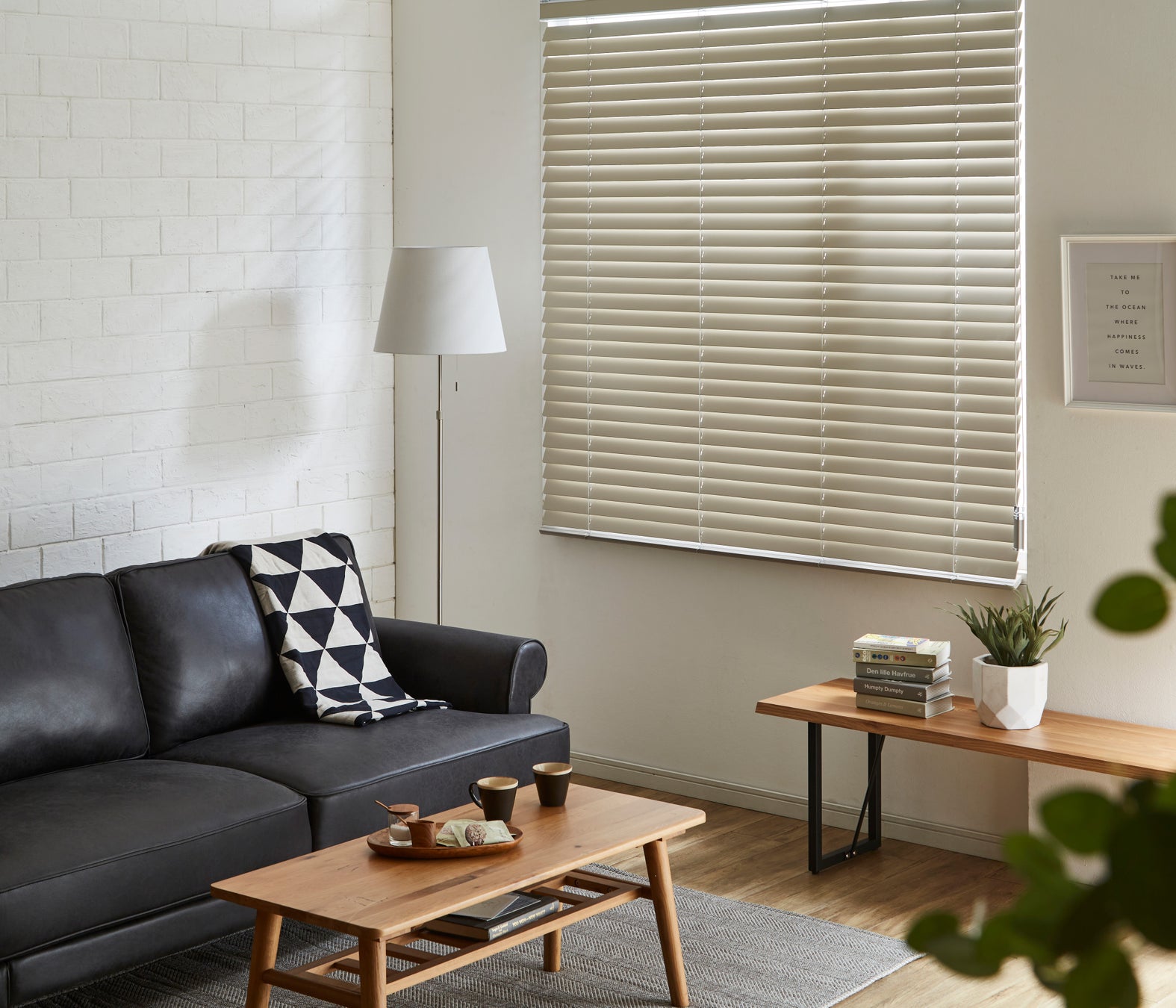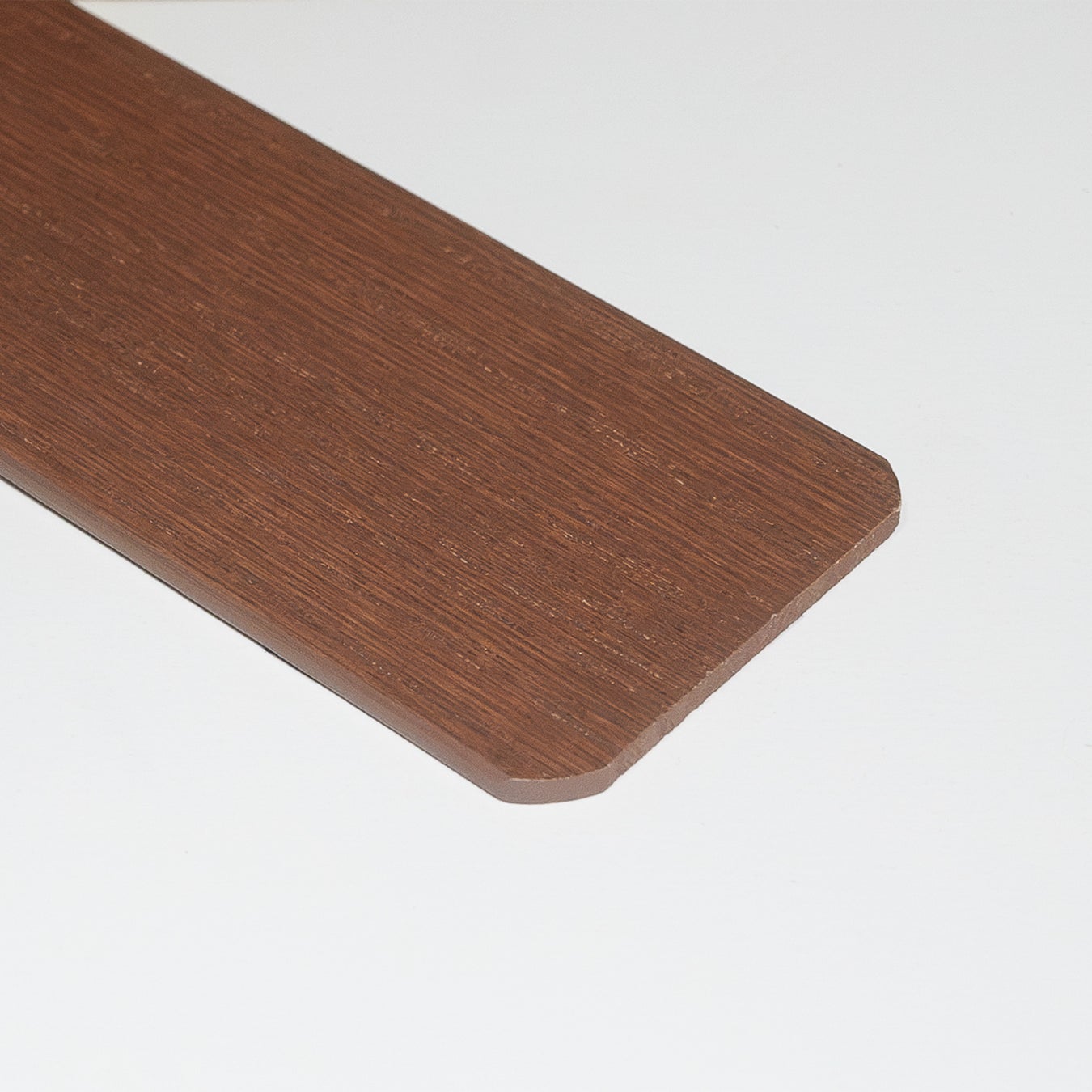 スラットの角は2種類からお選びいただけます。角を丸く加工することができるので、一層木の柔らかさを演出することができます。窓枠から出る形で設置したとき(正面付け)も、木口の色が揃うことで従来のウッドブラインドより美しくなります。