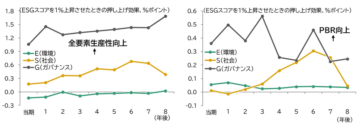 注2:当期から8期前までのESGスコアの変化が全要素生産性/PBRに与える影響を示す。