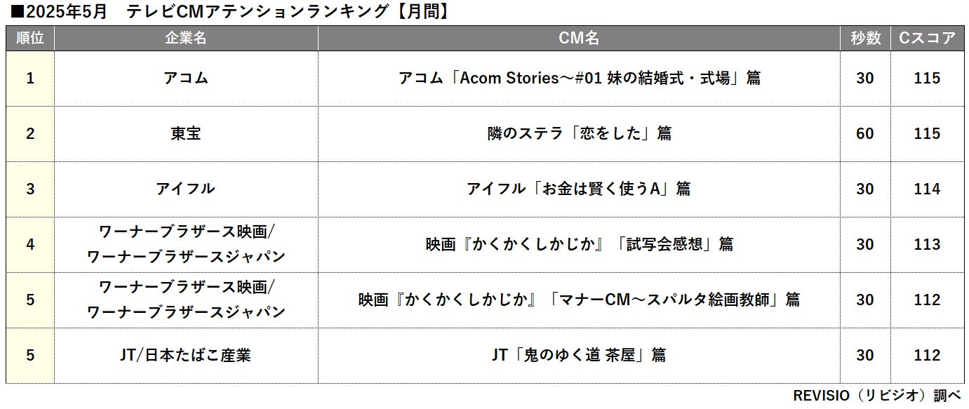 ご家庭に人体認識技術を搭載した機器を設置し、テレビスクリーンの「アテンション(注視)」を測るREVISIO株式会社(所在地 :東京都千代田区、代表取締役社長 郡谷 康士、以下REVISIO)は、 2025年5月に放送されたテレビCMを独自の「アテンション(注視)データ」で分析し、視聴者の視線をくぎづけにしたテレビCMのランキングを公開しました。