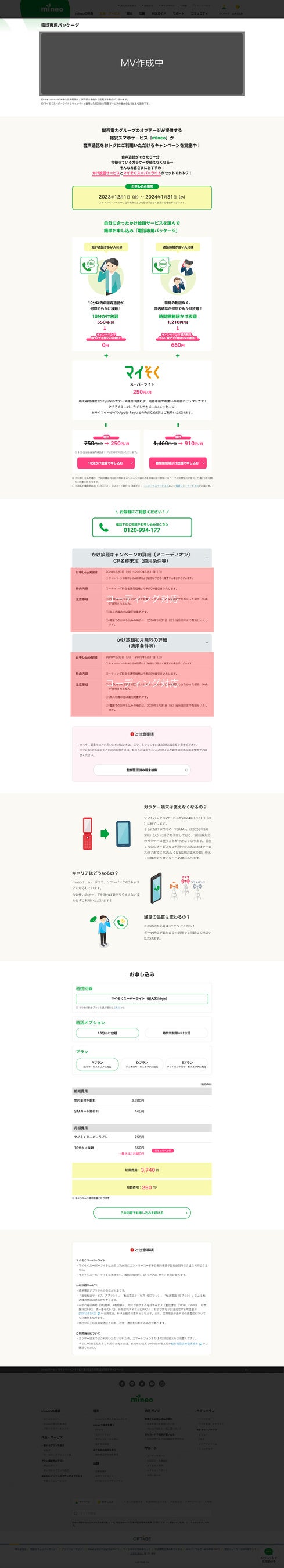 〇かけ放題550円割引キャンペーン ◆期 間:2023年12月1日(金)~ 2024年1月31日(水) ◆対 象:お申し込み期間中に「10分かけ放題」「時間無制限かけ放題」オプションサービスを 新たにお申込みいただいた方 ◆特 典:「10分かけ放題(550円/月)」「時間無制限かけ放題(1,210円/月)」のオプション料金を 最大4カ月間550円/月引き※ 〇かけ放題初月無料 ◆期 間:2022年3月1日(火)~2024年3月31日(日) ◆対 象:お申し込み期間中に「10分かけ放題」「時間無制限かけ放題」オプションサービスを 新たにお申し込みいただいた方。 ◆特 典:「10分かけ放題(550円/月)」「時間無制限かけ放題(1,210円/月)」のご利用開始月の オプション料金を無料といたします。 ◆URL : https://mineo.jp/service/voice/kakehoudai/ (2023年12月1日(金)9:00更新予定) *:すでにmineoをご利用中の方も対象です。 *:過去に同様のキャンペーンを適用している方は対象外です。 *:キャンペーンのお申し込み期間および内容は予告なく変更する場合がございます。 |