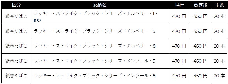 「ラッキー・ストライク・ブラック・シリーズ」5銘柄の小売定価を5月1日より20円引き下げ、450円に