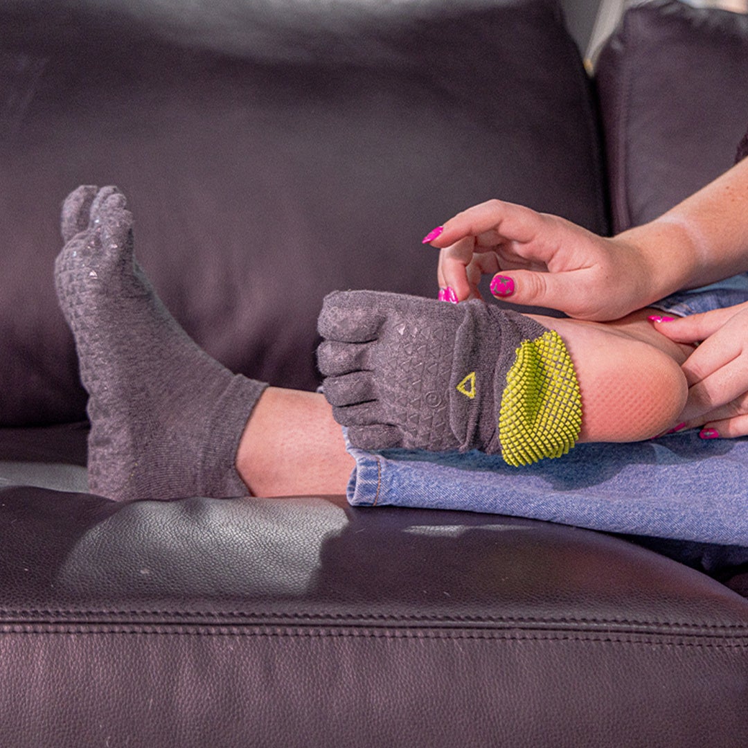 ソックスの内側に付いているナボソ独自のテクスチャーが、歩くたびに足裏と指先までしっかりと刺激を与えます。さらに、5本それぞれの足指のポケットは、足指を広げて自然なアライメントをサポートするように作られています。これに加えて、外側の強力なグリップでしっかりと地面をとらえることで、内側と外側の両方から足を安定させ、スムーズな動きへ導きます。