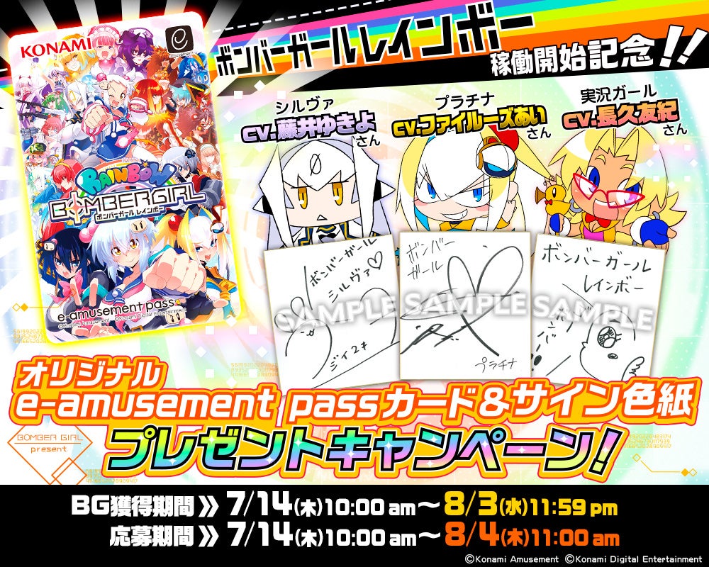 さらに、『ボンバーガール レインボー』の稼働を記念し、「オリジナルe-amusement passカード&サイン色紙プレゼントキャンペーン」も開催されます。