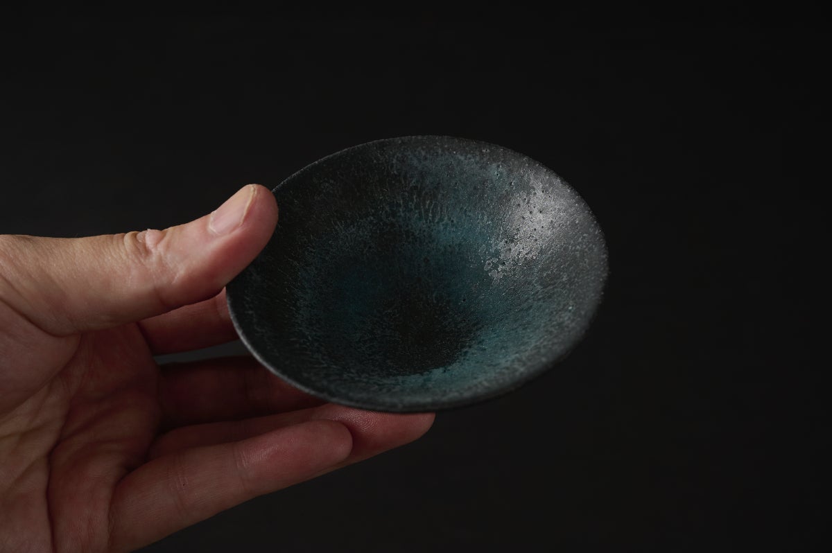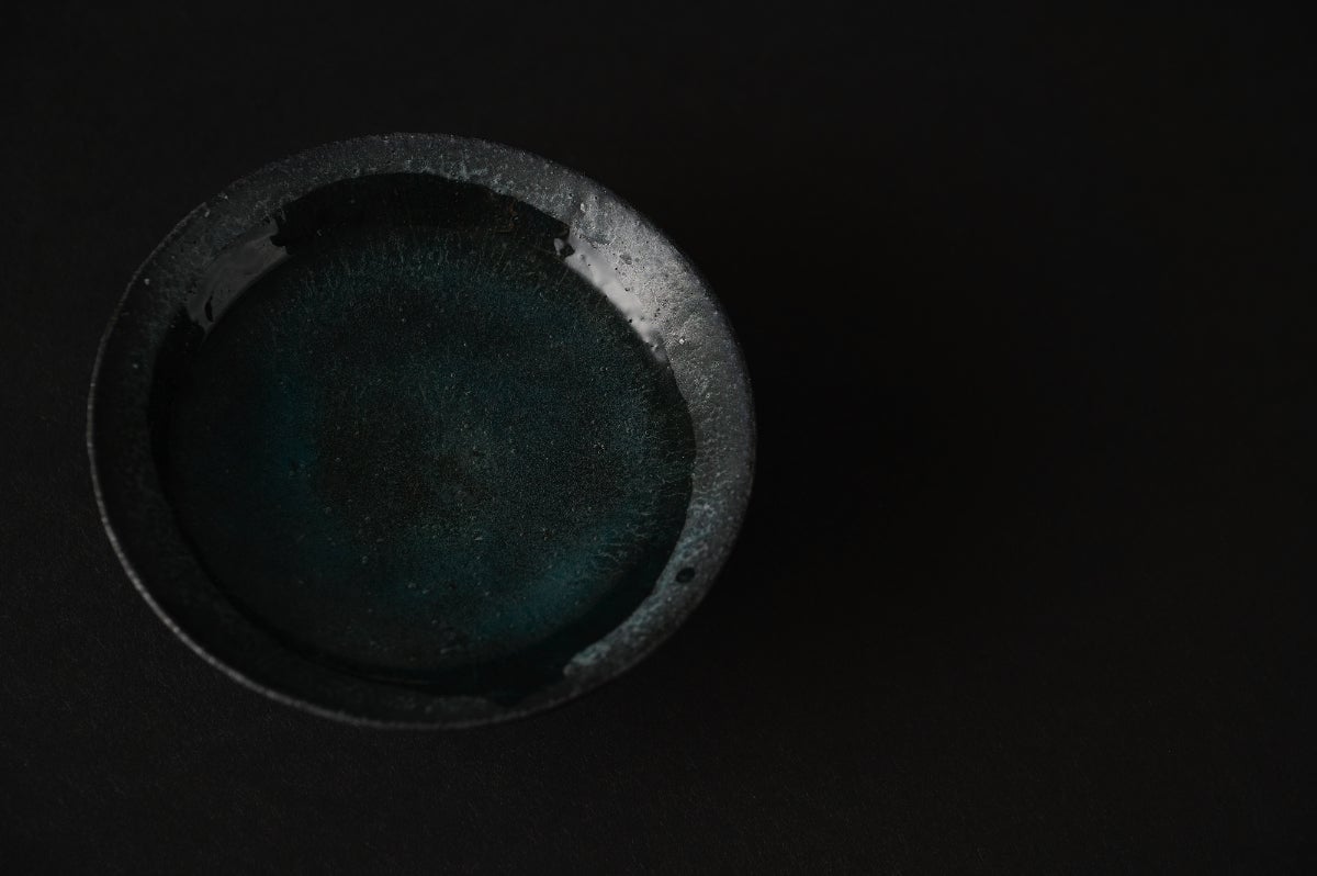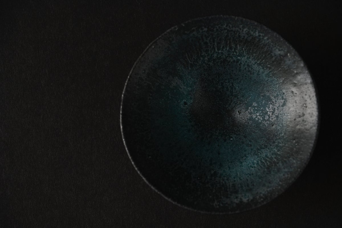 白い土で焼くとトルコブルーに発色する釉薬を、黒泥土の上に施釉することで、ただ青いだけはなく、漆黒の中の青のような絶妙な色合いを表現することができました。