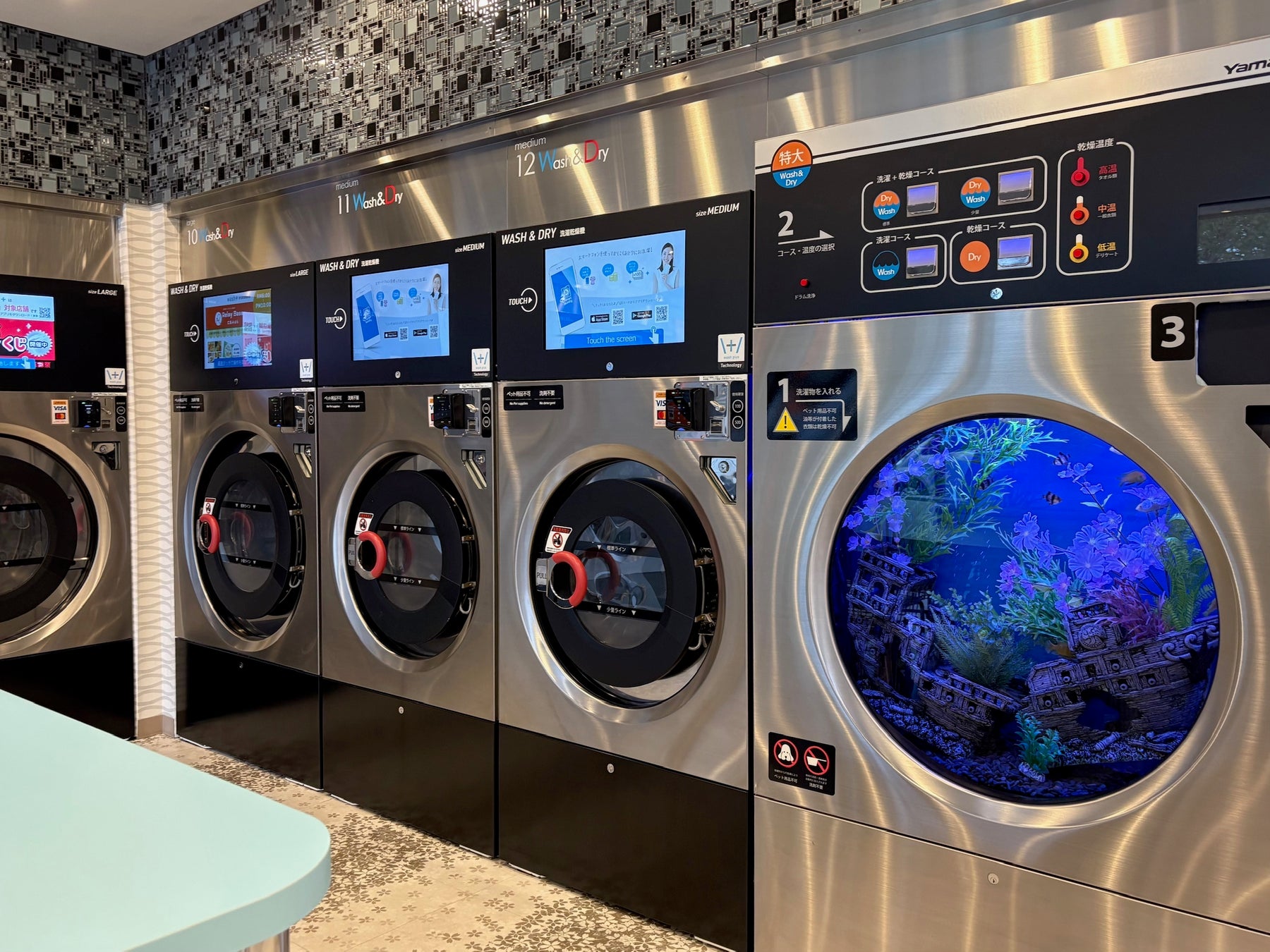 アレルゲンフリー・合成化学物質ゼロの「水で洗う洗濯」とともに、タッチパネル付き洗濯乾燥機や、多様なキャッシュレス決済対応、多言語化、業界初のダイナミックプライシング導入など、最先端の技術を展開するコインランドリー。