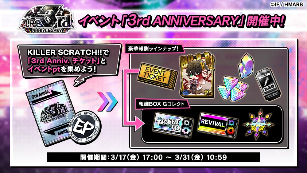 今回のイベントでは、KILLER SCRATCH!!をプレイしてイベントptや「3rd Anniv. チケット」を集めることで、3rd ANNIVERSARYを記念した描き下ろし限定のちびキャラのSRカード【3rd あにばーさりー】シリーズ、過去のストーリーイベントGコレクト限定SSRカードが当たるGコレクトが回せる「SSR確定復刻ストーリーGコレチケット」や「3rd Anniv. Gコレチケット:10回」「スペシャルスキルスター:SSR」など豪華報酬を獲得することができます。