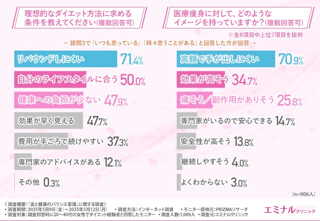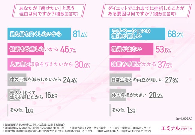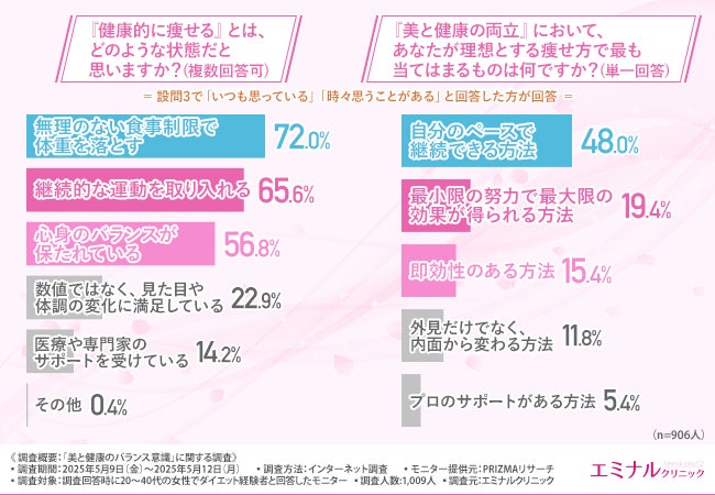 そこで今回、「エミナルクリニック」は、20~40代の女性でダイエット経験者を対象に、「美と健康のバランス意識」に関する調査を実施しました。