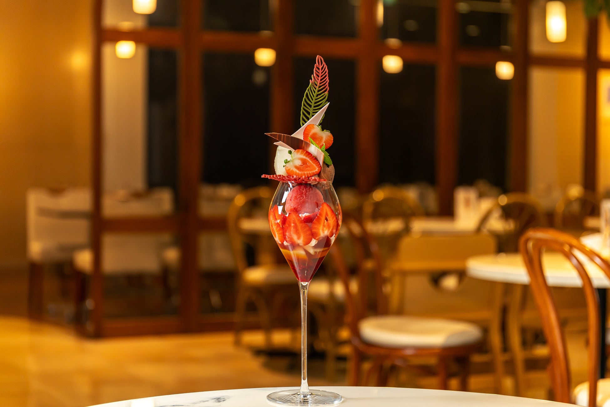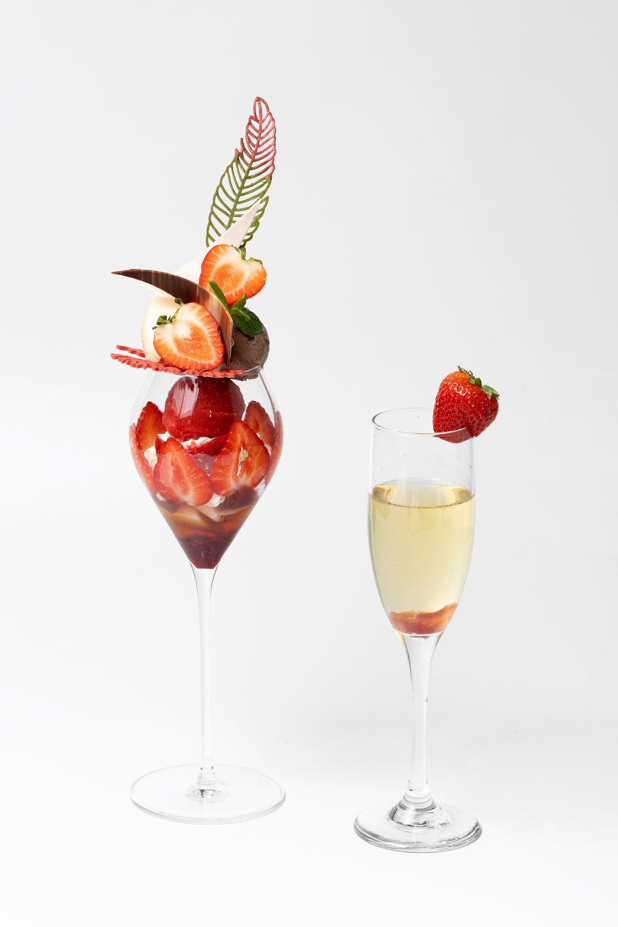 シャンパングラスに入ったラグジュアリーパフェで、バーのようなひとときを 夜だけの特別デザート いちごと洋梨が主役の『パルフェ ルージュ・エ・ブラン』登場