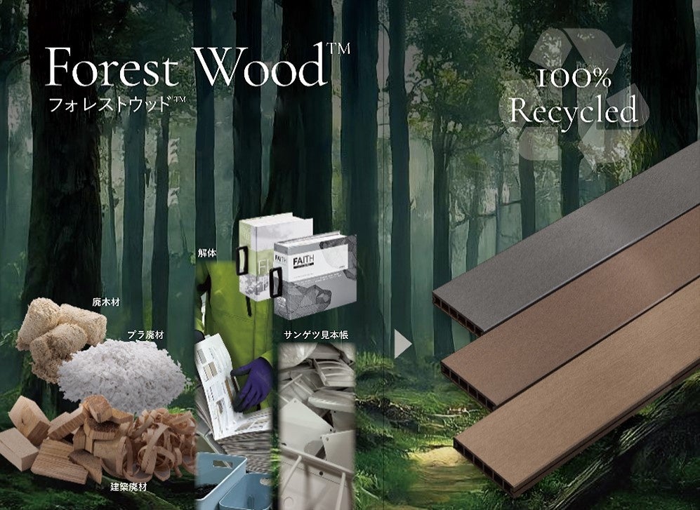 株式会社サンゲツ(本社:愛知県名古屋市、代表取締役 社長執行役員:近藤 康正、以下:サンゲツ)と、ミサワホーム株式会社(本社:東京都新宿区、代表取締役 社長執行役員:作尾 徹也、以下:ミサワホーム)は、100%リサイクル原料の人工木ウッドデッキ「フォレストウッド™」を共同開発しました。「フォレストウッド™」は、ミサワホームが取り扱う再生木材とリサイクルチップに、サンゲツの発刊する商品カタログ(以下、見本帳)の部材を一部使用した、アップサイクルのエクステリア商品です。当該商品は2025年度に発売を予定しており、サンゲツは今後、エクステリア商品の拡充・強化を進め、幅広い市場に向けて販売していきます。