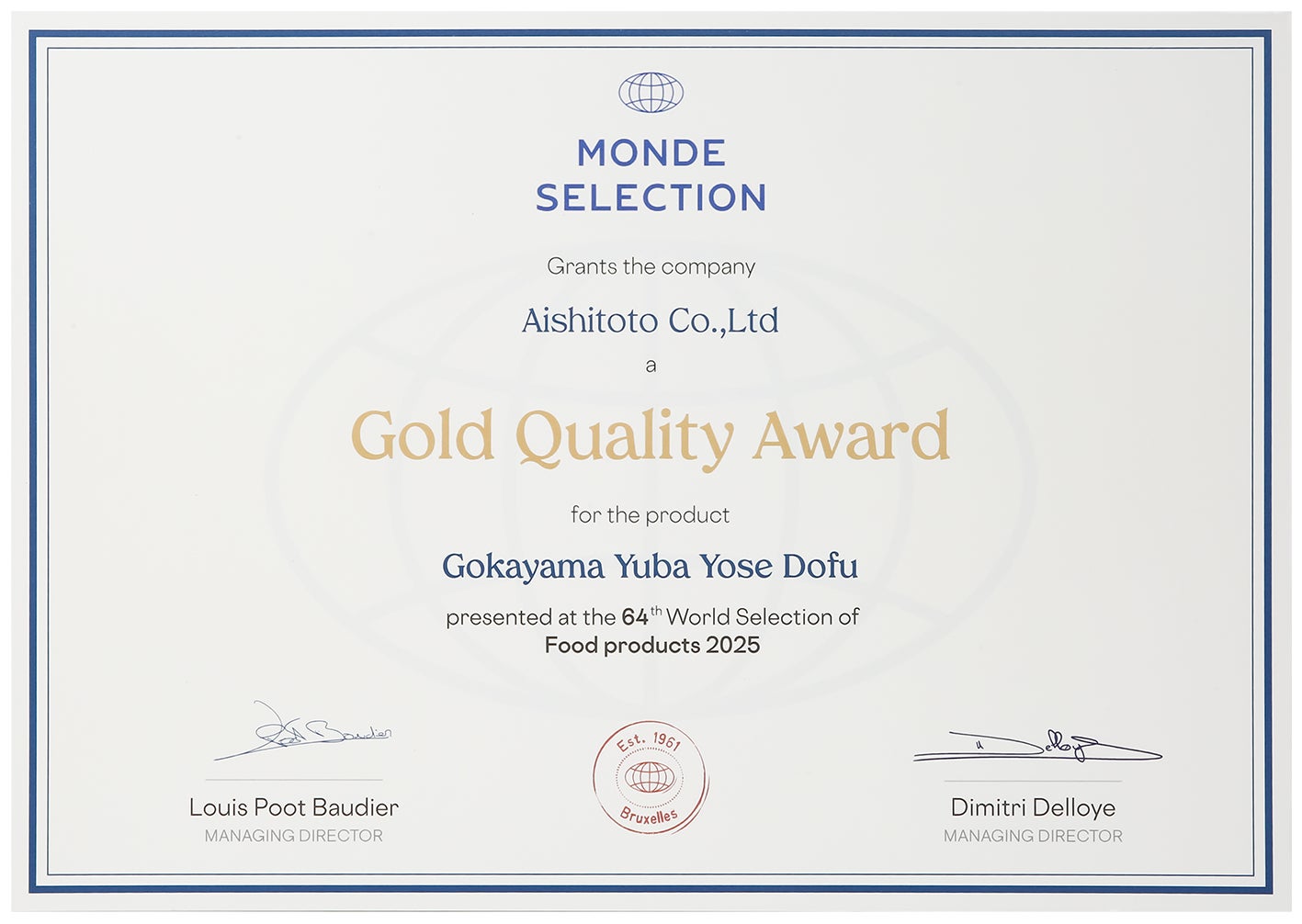モンドセレクション(Monde Selection)は、1961年にベルギーのブリュッセルで設立された国際的な品質評価機関です。世界各国から出品される食品、飲料、化粧品などの消費財を、独立した専門家が厳格な基準に基づいて評価し、品質に応じた賞を授与しています。その評価基準の厳しさから、受賞は製品の品質に対する国際的な信頼の証とされています。