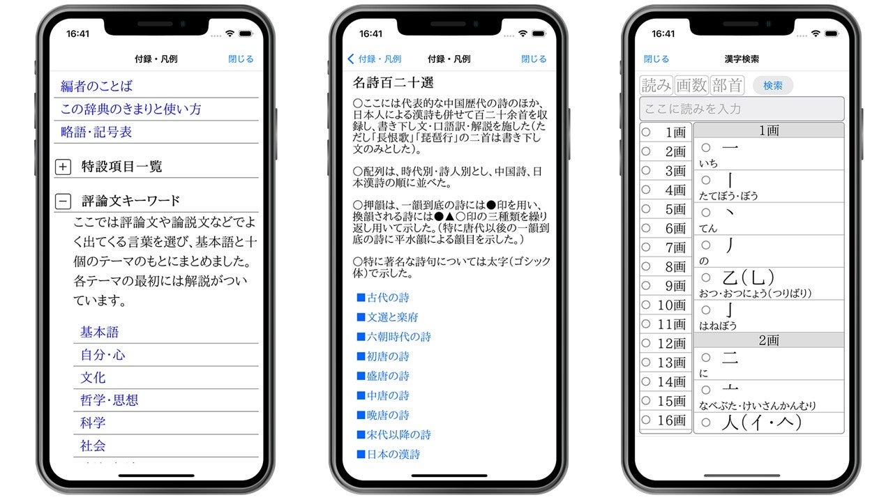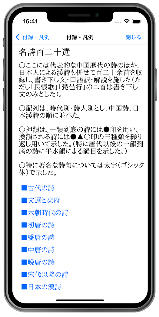 アプリのみのオリジナルコンテンツ「名詩百二十選」「日本漢詩文に登場する地名」も収録。書き下し文、日本語訳、解説付きで楽しみながら漢詩の学習ができます。