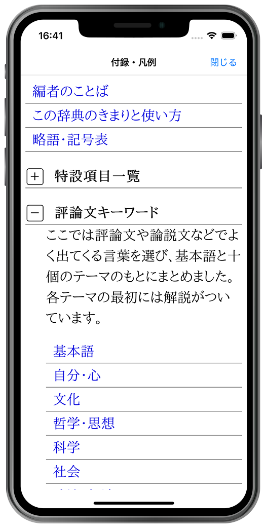 アプリのみのオリジナルコンテンツ「評論文キーワード」では、評論文などで頻出する言葉を選び、基本語と十個のテーマにまとめ、本文とは別に簡潔な解説を付けました。