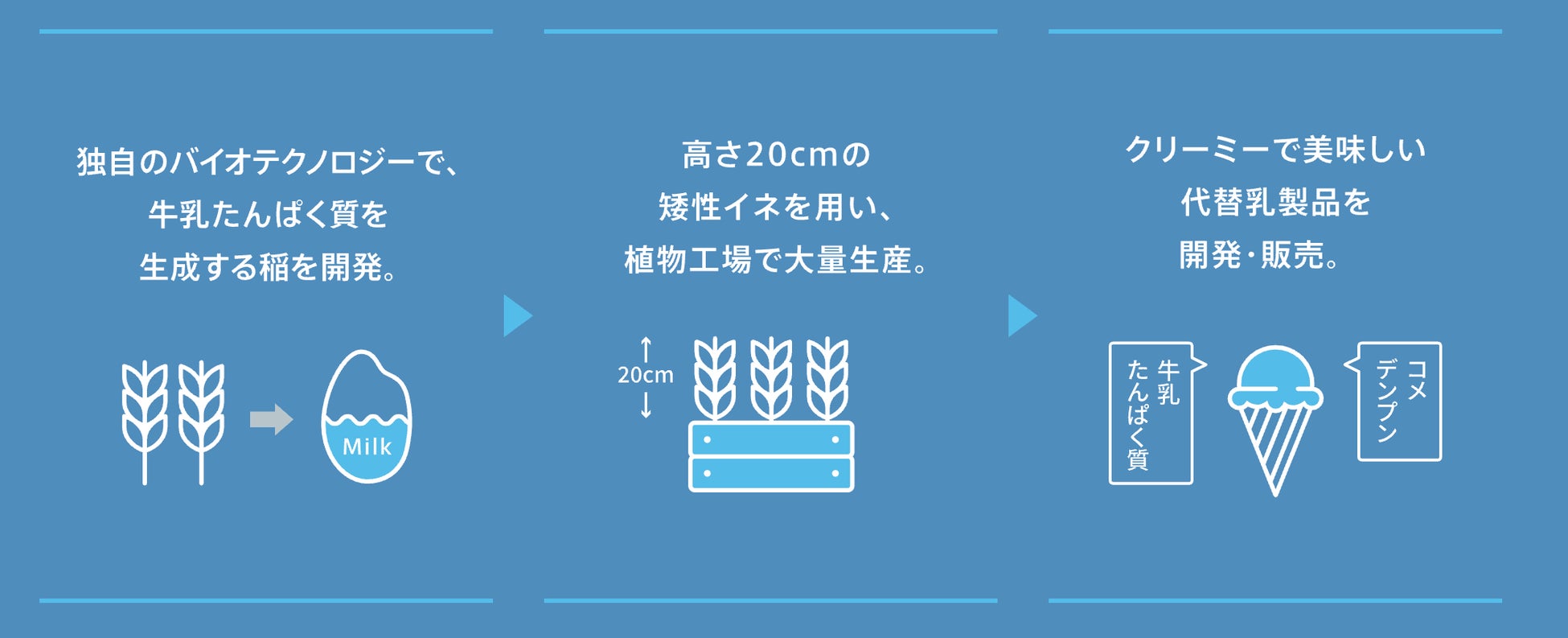 乳製品の主要成分である牛乳たんぱく質の一つ、カゼインを生成するイネの研究開発を加速させ、商業スケールに対応できるイネを開発いたします。