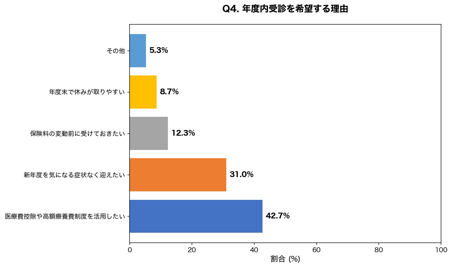 調査では12.3%の方が「保険料の変動前に受けておきたい」と回答しています。75歳到達による後期高齢者医療制度への移行や、前年所得の確定による自己負担割合の変更は4月に反映されることが多いため、現行の負担割合を維持したい場合は年度内の受診が有利です。また、4月から新しい職場の健康保険に切り替わる方も、手続きの煩雑さを避けるため3月中の受診を希望される傾向があります。