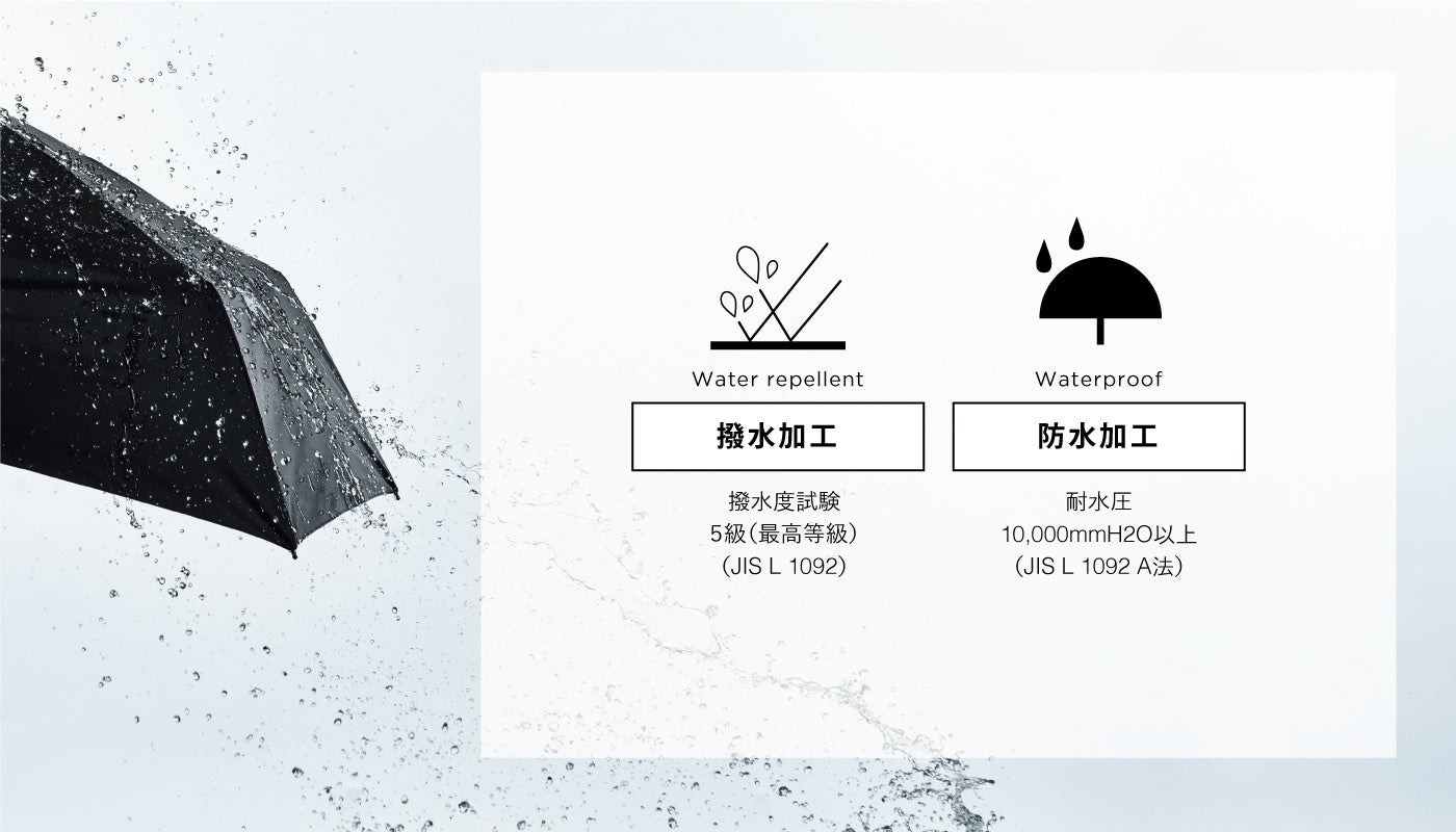 最高等級の撥水力で雨粒と生地の接触する面積が減ることで、水滴が転がりやすくなり、雨の日のストレスを軽減。
