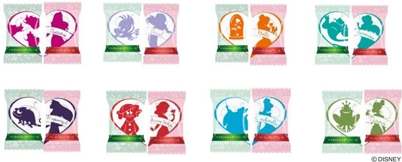 ・個包装は、2つの味わいを組み合わせることで絵合わせが楽しめます。プリンセスとその大切な仲間たち、またはアイテムをうまく組み合わせると魔法がかかって1つのハートが出来上がります。絵柄はラッキーデザイン含め全35種類です。