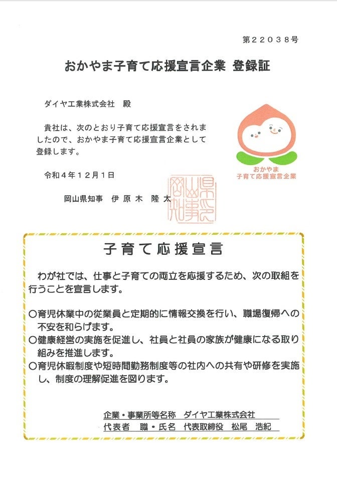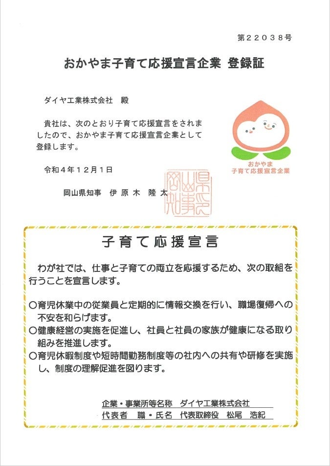 ダイヤ工業株式会社は岡山県の「おかやま子育て応援宣言企業」の宣言について、新たな3つの宣言を再登録いたしました。