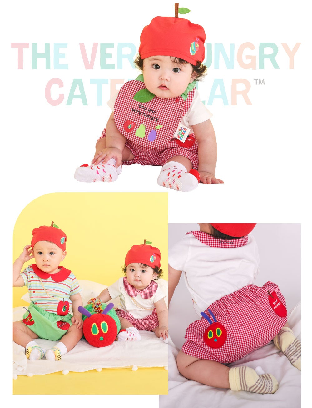 『はらぺこあおむし』のお顔モチーフに、りんごのパッチをあしらったブルマ&りんご帽子が登場。