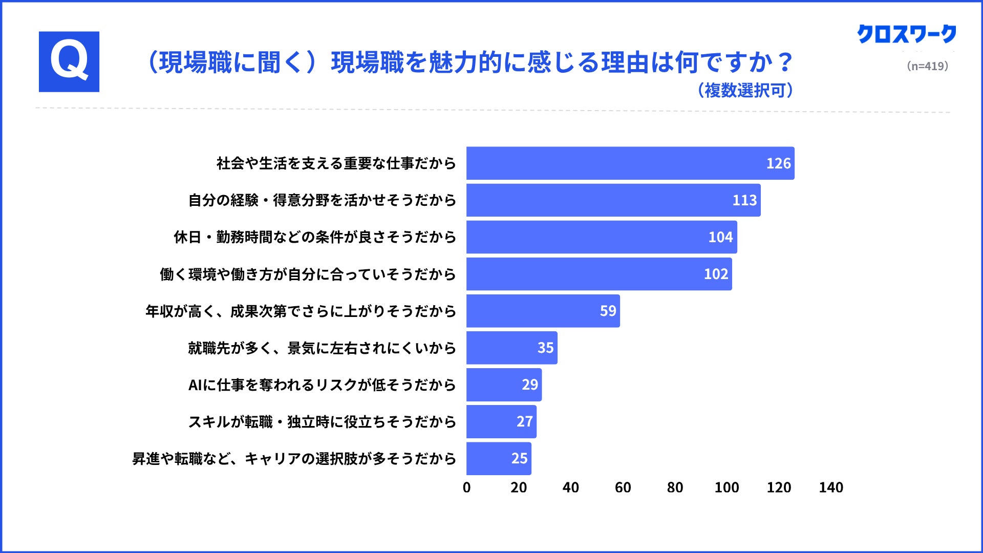 現場職かつ、現場職に魅力を感じると答えた人419人に理由を聞いたところ、最も多かったのは「社会や生活を支える重要な仕事だから」で約3割の126人でした。次いで「自分の経験・得意分野を活かせそうだから」113人、「休日・勤務時間などの条件が良さそうだから」104人、「働き方が自分に合う」102人が続きます。