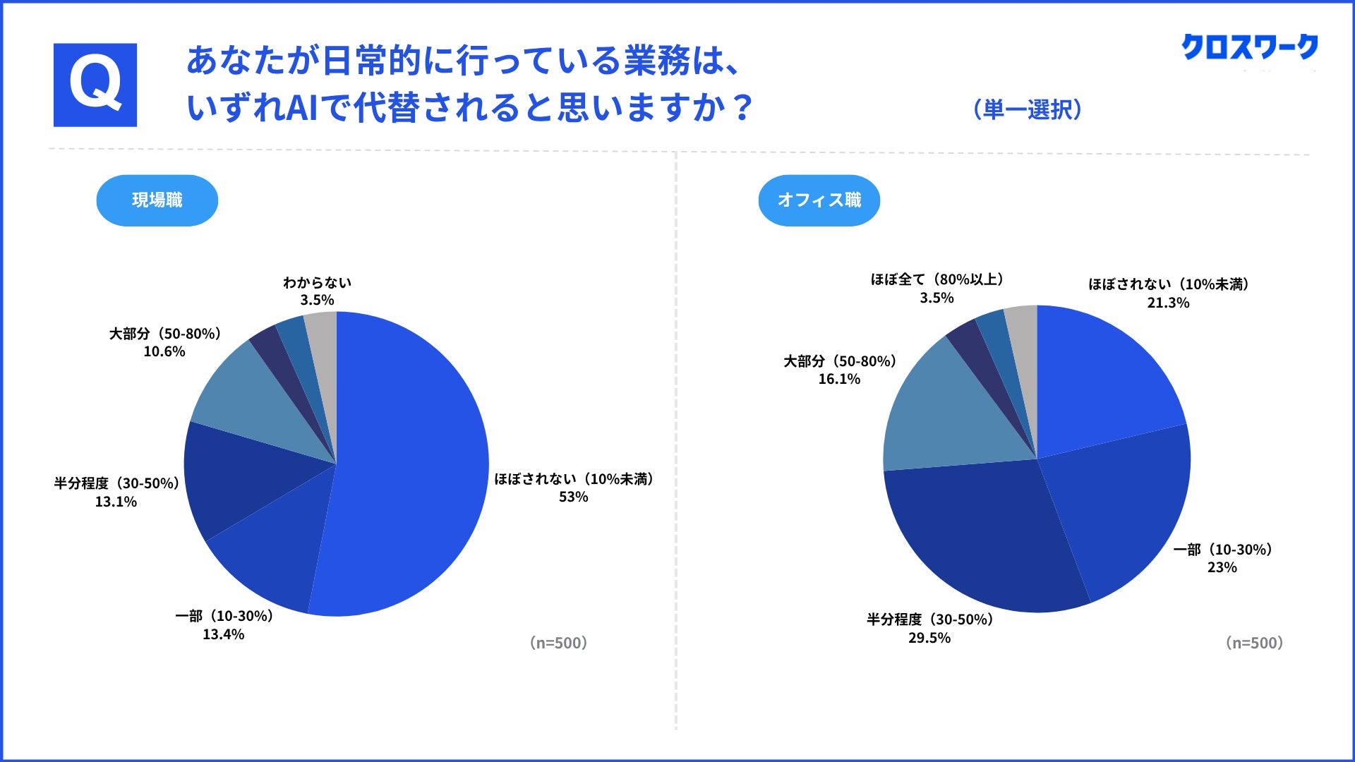 オフィス職は「いずれAIに代替される」という考えが広がっているのに対し、現場職では「ほぼされない」と考える人が多数派であり、自分の業務に対するAIリスクの受け止め方に大きな差があることが浮き彫りになりました。