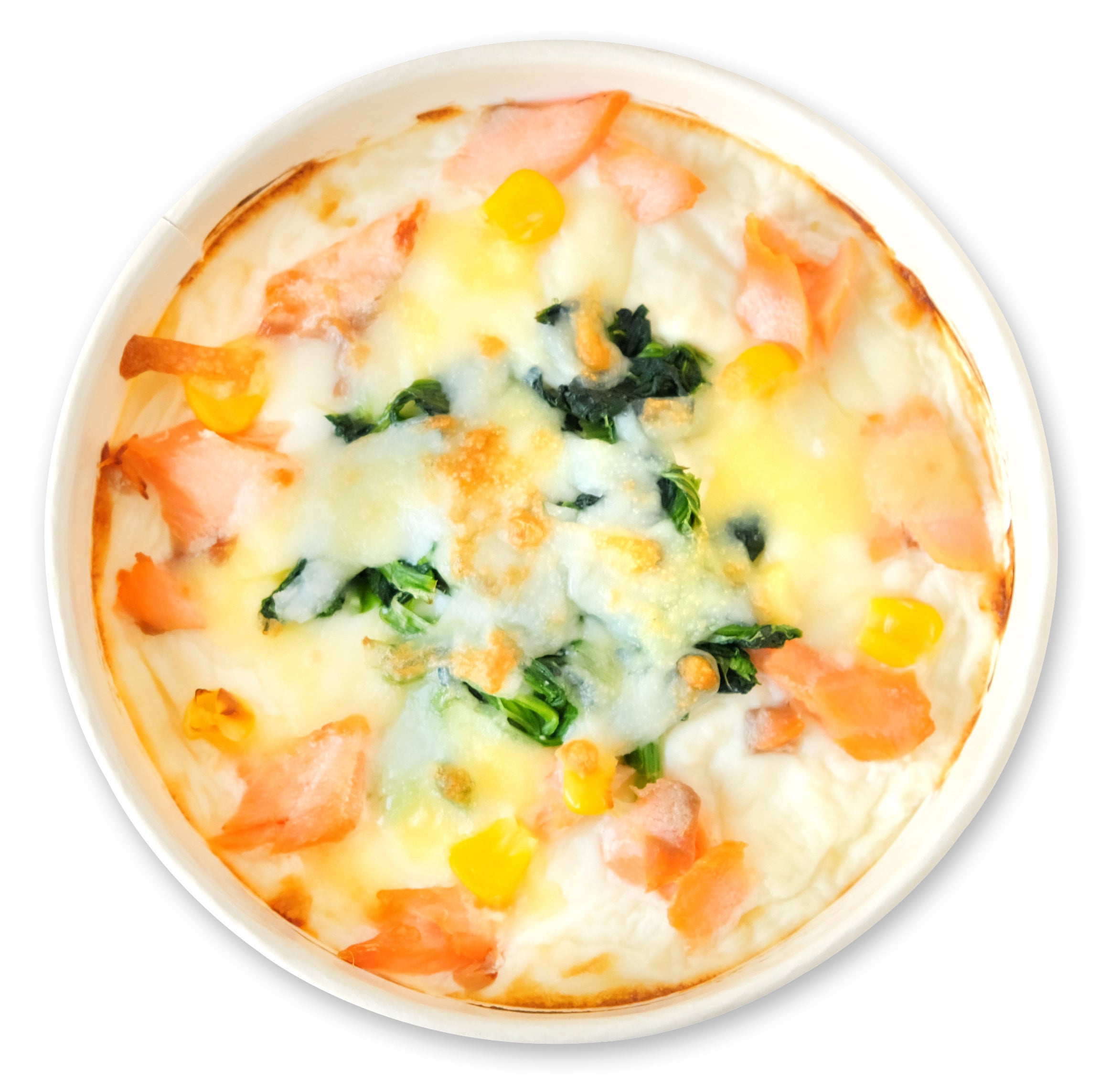 ほうれん草・サーモン・玉ねぎ・コーンが入ったとろ~りなめらかなグラタンです。熱々にしてパンと一緒にお召し上がりください。