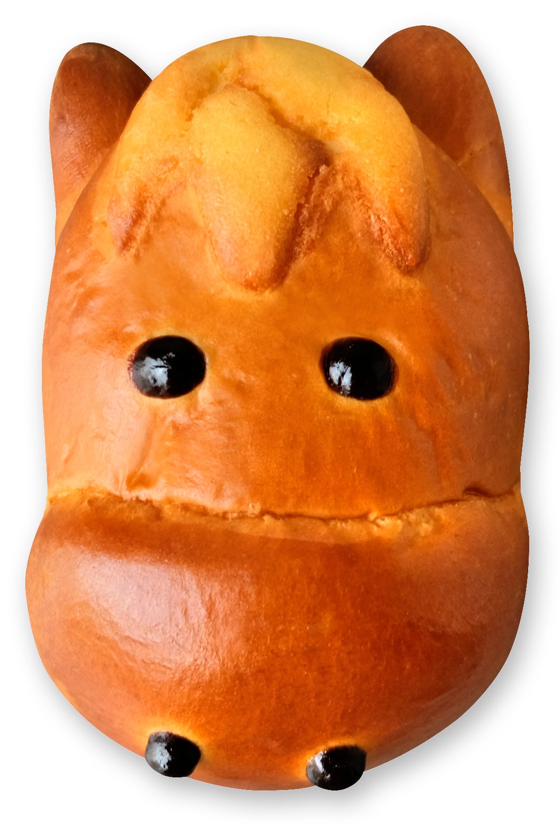 やさしい甘さのカスタードクリームを包んだパンに、ビス生地でたてがみをあしらい、チョコレートでお顔を描いた、かわいらしいお馬さんのパンです。