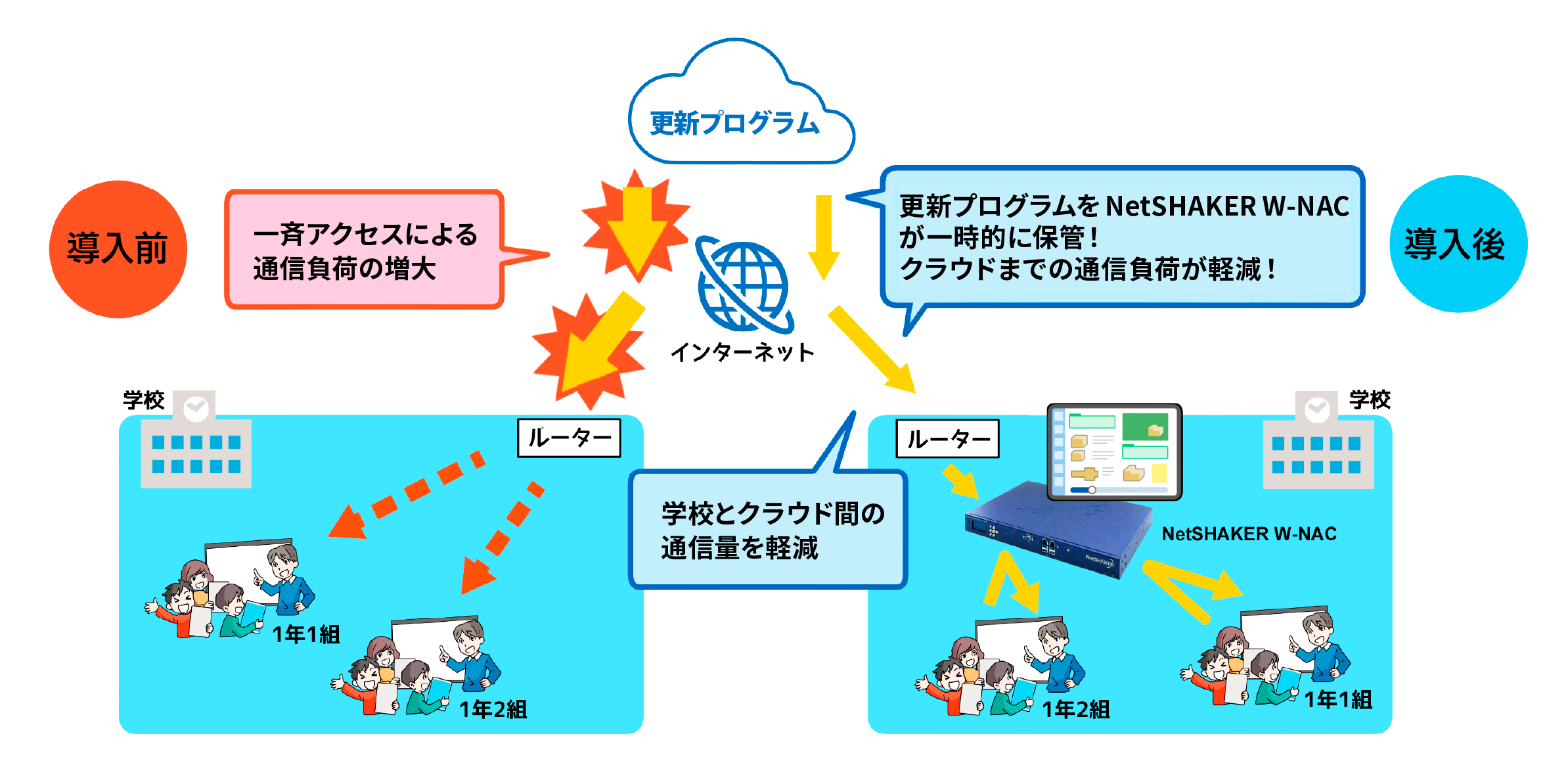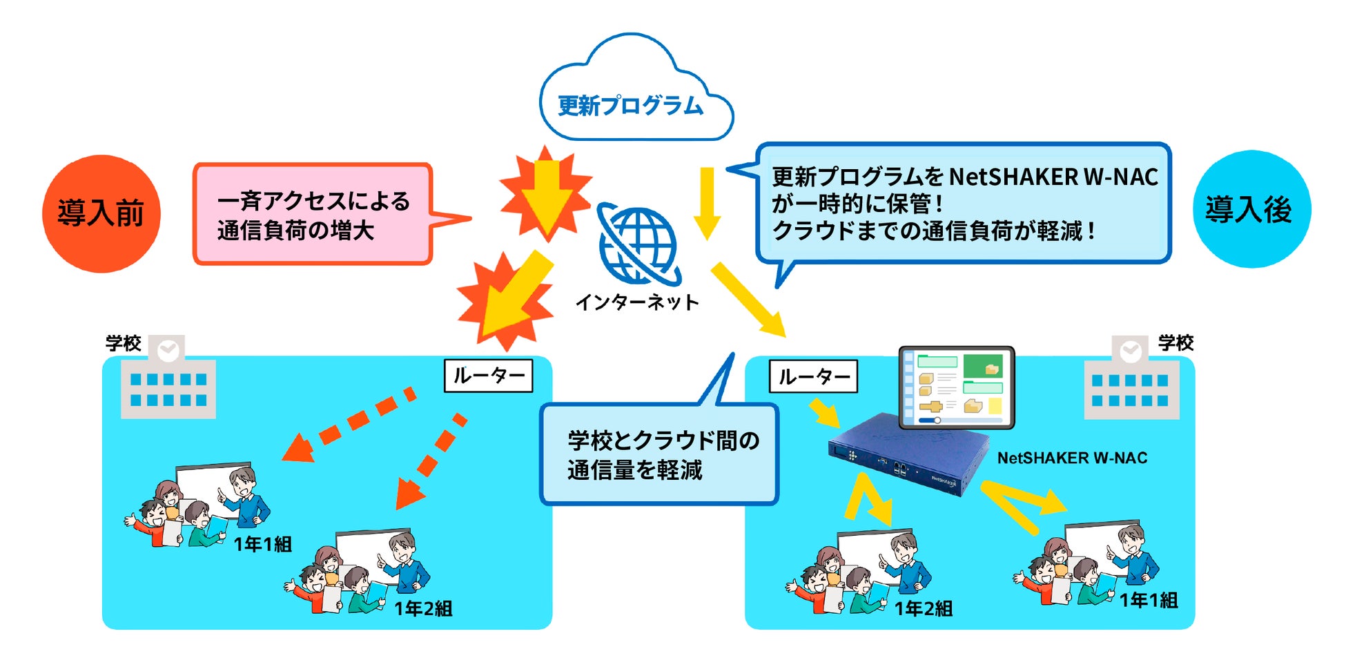 学校へのインターネット関連機器導入は夏休み期間中に行われることが多いため、その時期に向けて「NetSHAKER」のキャッシュ機能を一層強化。夏休み明けから安定した回線環境のもとで授業を進められるようになります。