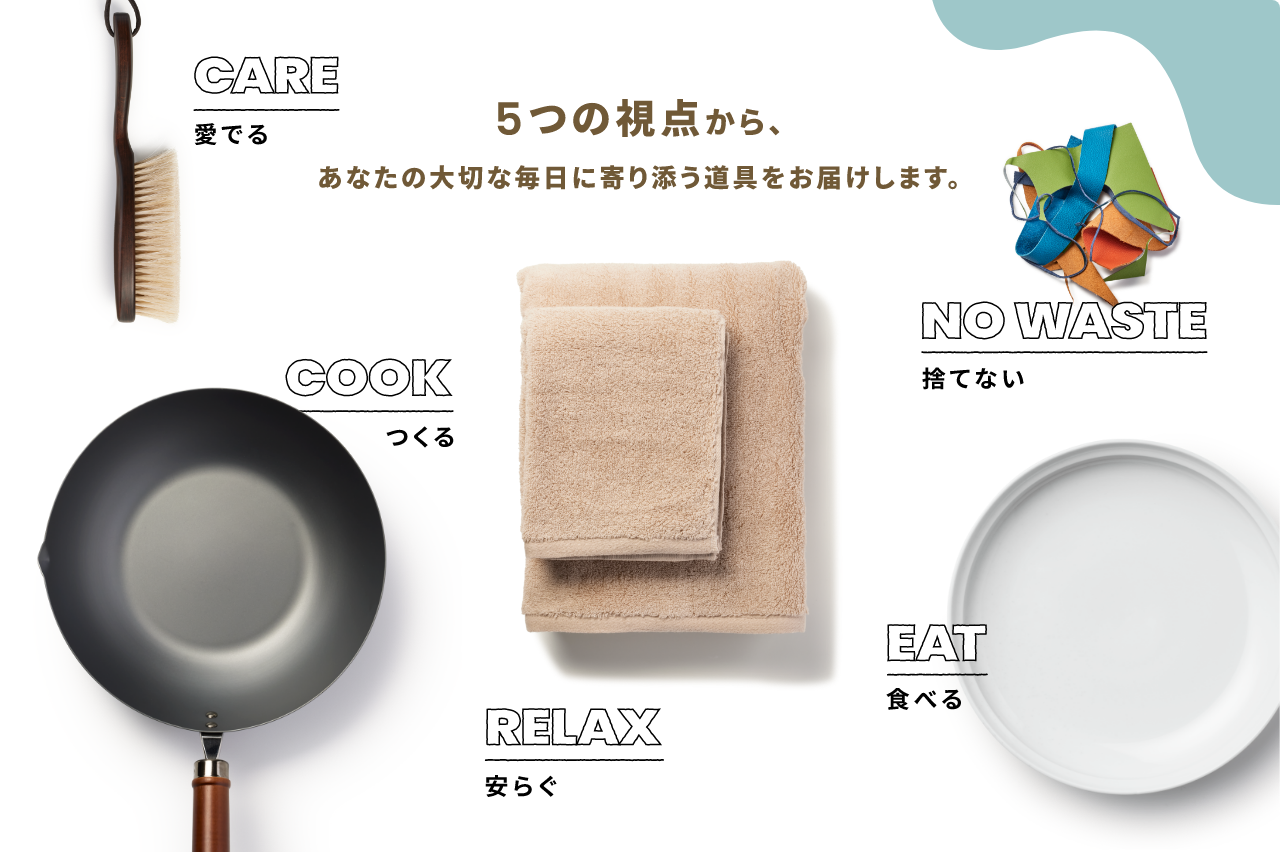 リニューアルした特設サイトでは、「ものと暮らす」をより具体的にした「つくる」、「食べる」、「安らぐ」、「愛でる」、「捨てない」の5つの視点から、毎日に寄り添うアイテムをご提案しています。