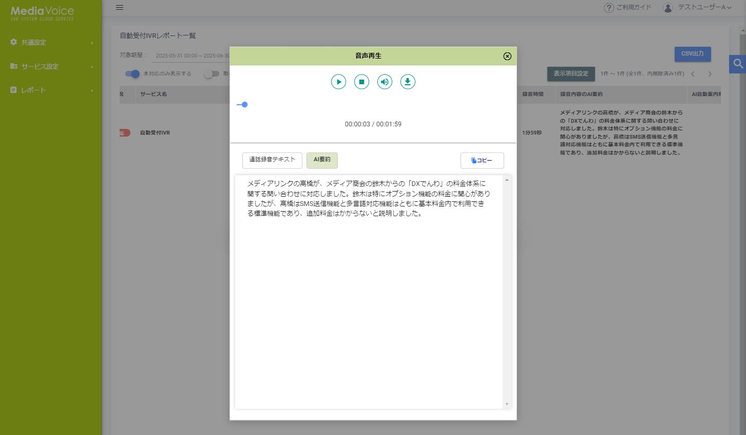 テキスト化された通話内容(全文・AI要約文)は、レポート画面から簡単に確認できます。