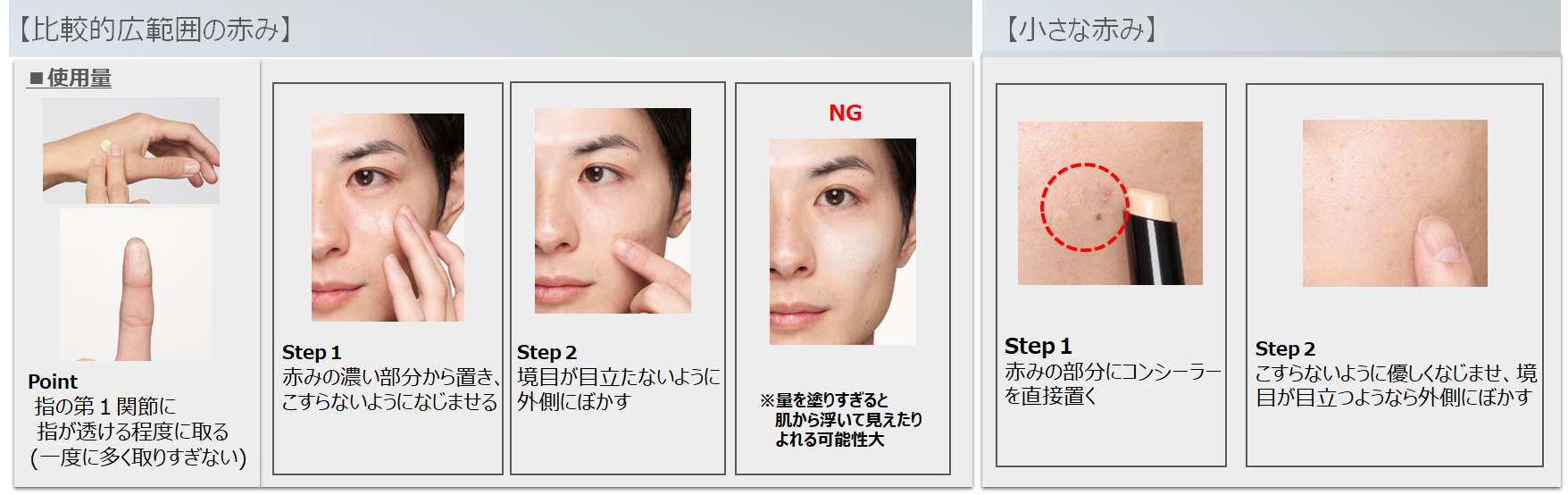 比較的赤みが広範囲の場合は、グリーンやイエローのコントロールカラーなどののびやなじみの良いアイテムを、ニキビ跡など小さな赤みには、硬めのコンシーラーがおすすめ。