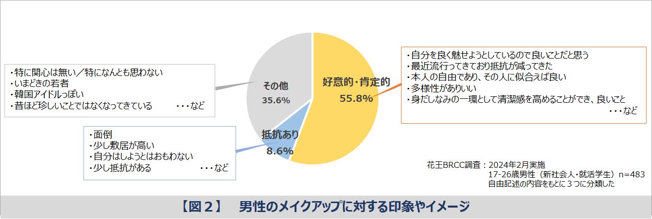 また、メイクアップに関する質問の中で、男性がメイクすることに対してどのような印象やイメージがあるのかを自由記述で聞いたところ、肯定的で好意的な意見に分類されるものが半数以上(55.8%)を占めました(図2)。「最近流行ってきており抵抗が減ってきた(25歳・新社会人)」「最近は普通になってきている(22歳・就活生)」「本人の自由であり、その人に似合えば良いのではないかと思う。(22歳・新就活生)」など、メイクは誰もが自由にするものであるといった回答や、「多様性があり良いと思う(22歳・新社会人)」「自分を良く魅せようとしているので良いことだと思う(21歳・就活生)」「身だしなみの一環として清潔感を高めることができ、良いことだと思う。(21歳・新社会人)」「身だしなみに気を遣っているのは男女関係なく好印象(21歳・就活生)」などが挙げられました。それに対して、「すこし面倒くさいなと思う(23歳・就活生)」「少し敷居が高い印象(22歳・就活生)」「自分はしようとは思いません(18歳・新社会人)」といったやや抵抗感を感じている回答は1割弱(8.6%)に留まっていました。