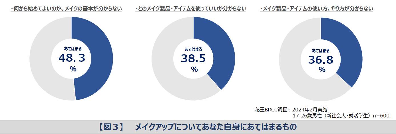 その一方で、自分自身にあてはめると、メイクに対しては「何から始めてよいのかメイクの基本がわからない」と答えた人が48.3%と半数近くを占めていました。また、「どのメイクアイテムを使ってよいのかわからない」(38.5%)、「メイクアイテムの使い方がわからない」(36.8%)についても約4割の人があてはまり(図3)、美容に興味関心がある人でも、まだまだメイクに対してわからないことがあり、迷っている人がいることが明らかとなりました。