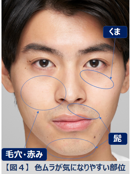 そこで、花王BRCCのメイクアップアーティストから、メイクをしたいけれど何からやればよいかわからない人に誰でも簡単にできる『身だしなみメイク』をご紹介します。まずは、肌の色ムラが気になる部分(図4)があれば、その部分を均一に整えることから始めてみましょう。それだけで清潔感のある身だしなみの整った印象を与えることができます。赤みやニキビ跡、髭、クマだけでなく、毛穴の凹凸によってできる影で色ムラがあるように見えることも。気になる色ムラの状態別に、BBクリームやコンシーラーなど肌の色を整えるアイテムの選び方と使い方をご紹介しますので、ご自身にあてはまるものから挑戦してみましょう。