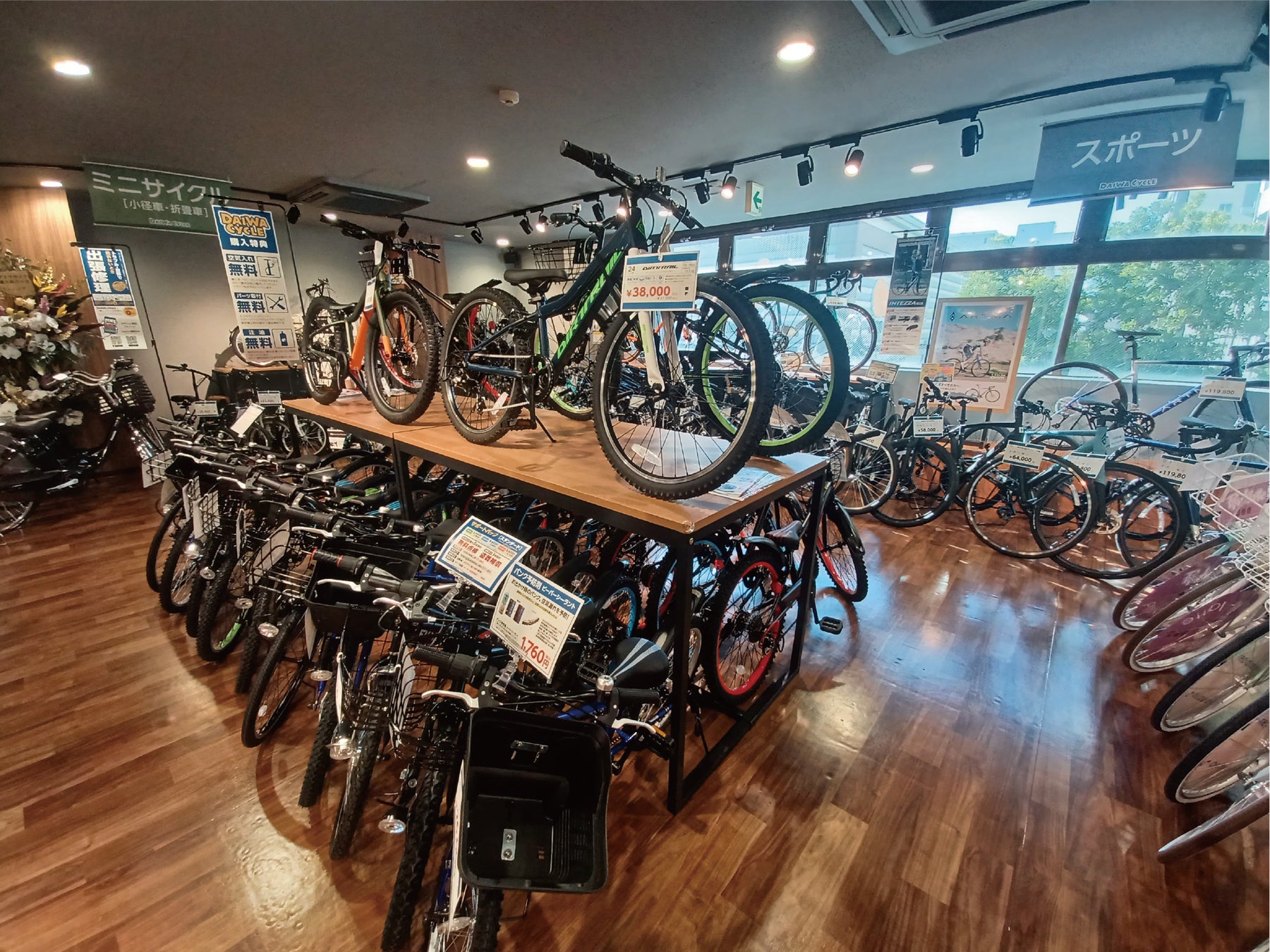 また、2階にはシティサイクル、スポーツサイクル、ミニベロ・折畳車、子供車と幅広い年齢の方に向けた自転車をご用意いたしております。