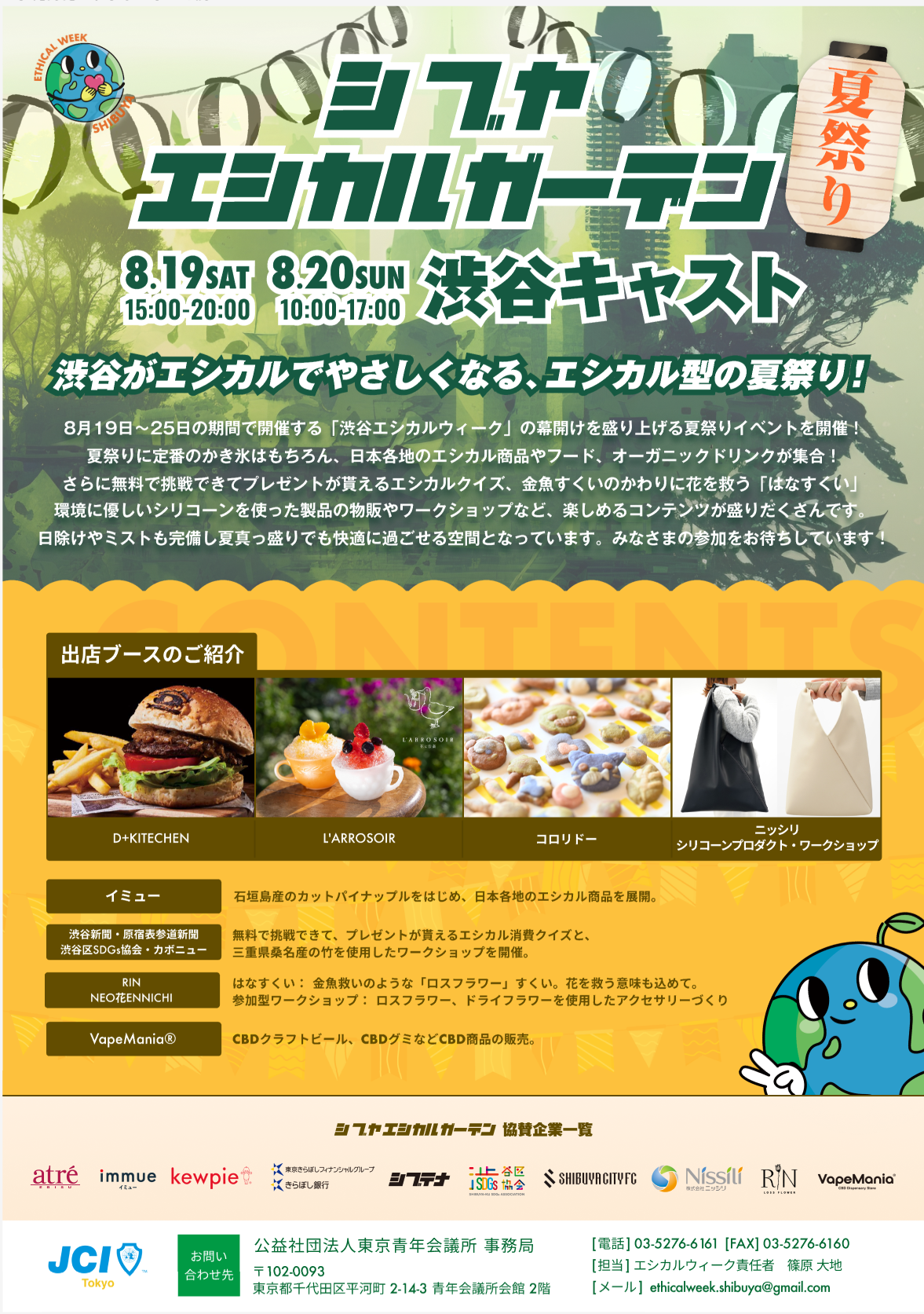 公益社団法人東京青年会議所 渋谷委員会は、8月19日(土)・20日(日)の2日間にわたり、”日本で一番エシカルな夏祭り”を目指し、渋谷エシカルガーデンを渋谷キャストにて入場無料で開催します。