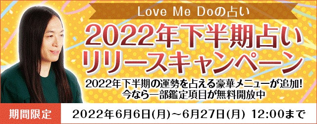 有名芸能人の結婚やスキャンダルから自然災害、政治・経済まで様々なニュースを的中させる『予言的中の占い師』Love Me Do。現在、月額公式サイト『ラブちゃん占い』にて、『Love Me Doの占い 2022年下半期占い リリースキャンペーン』を開催中です。キャンペーン期間中限定で、2022年下半期の運勢を占う豪華鑑定の一部鑑定項目を無料公開いたします。ぜひこの機会にお試しください。