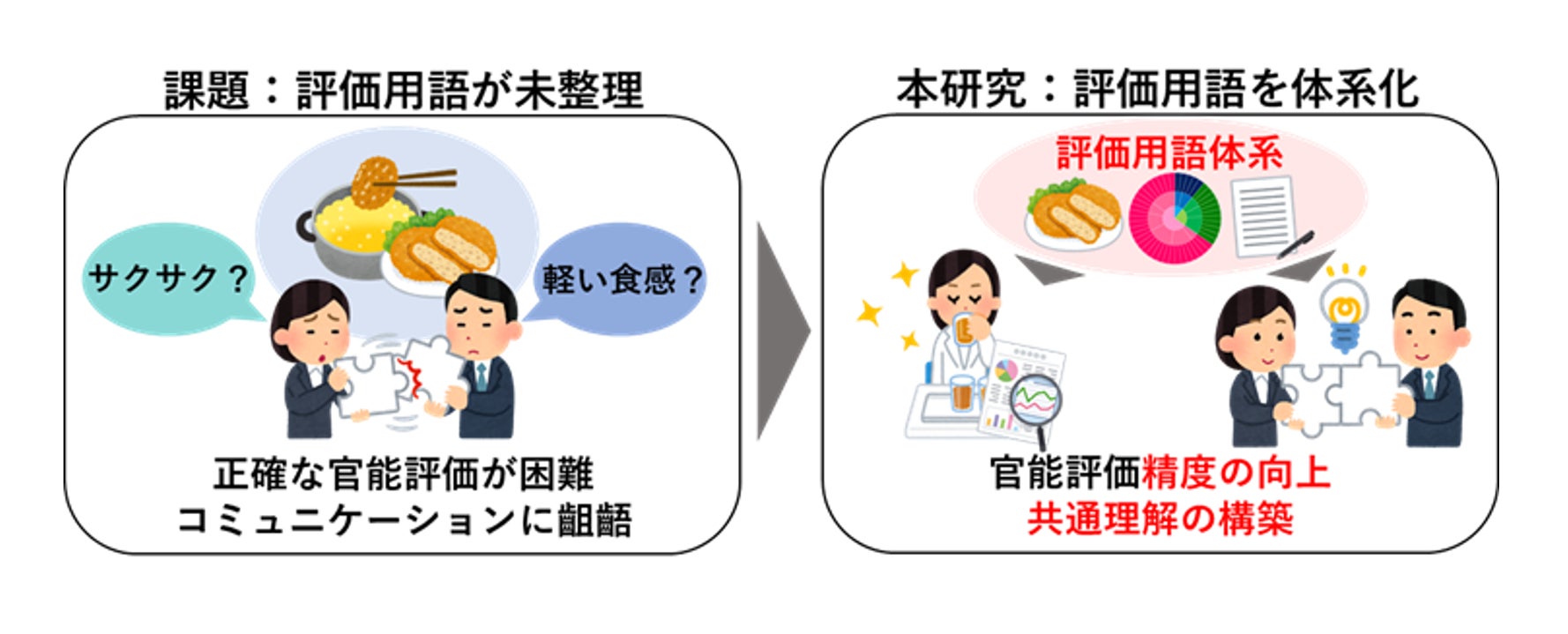 近年、市販・業務用のフライ食品の需要が増加しています。それに伴い、フライ食品のおいしさを構成する要素(衣のサクサクした食感や、食欲をそそる香り、見た目等)を数値化する技術に対するニーズが高まっています。コロッケをはじめとするフライ食品のおいしさという価値を向上させるには、分析機器による評価だけではなく、「人が実際に食べてどう感じるか」という官能評価の視点が重要です。官能評価は、フライ食品が消費されるまでのあらゆる工程(原料メーカーや食品メーカーにおける研究開発・生産~加工・流通工程および、その先の消費者が購入して食べる消費工程)に深く関わっており、おいしさ価値についての共通理解を形成するために重要となっています。しかし、官能評価に用いる言葉(評価用語)の定義や用途が人や組織によって違うことで、官能評価の精度が低くなることが課題となっていました。そこで当研究グループは、フライ食品の官能評価の精度向上とコミュニケーションの円滑化を目指し、コロッケの官能評価用語体系を構築することを目的に、共同研究を実施しました(図1)。